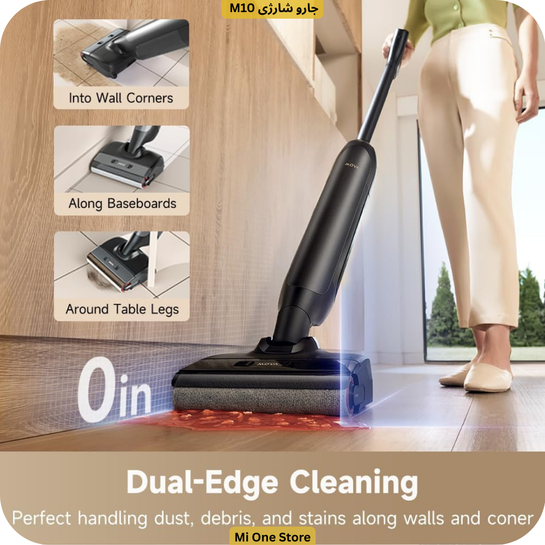 جارو شارژی M10 دارای برس دو لبه با طراحی صفر اینچی است، این دستگاه امکان تمیز کردن دقیق گوشهها، کنارهها و قرنیزها را فراهم میکند. این ویژگی باعث میشود هیچ نقطهای از دید دستگاه پنهان نماند. برخلاف بسیاری از جاروهای شارژی که در کنارهها عملکرد ضعیفی دارند، مووا M10 بهطور کامل آلودگیها را از لبهها جمعآوری میکند و نظافتی یکدست ارائه میدهد.