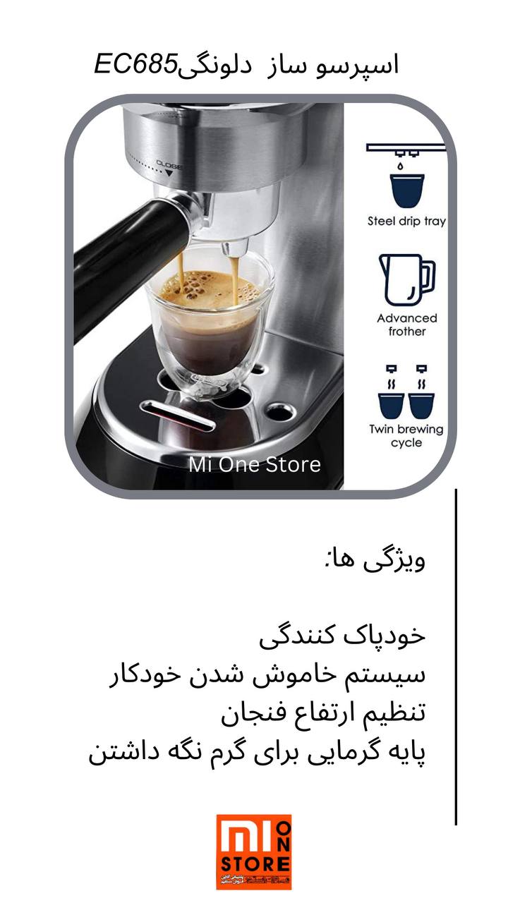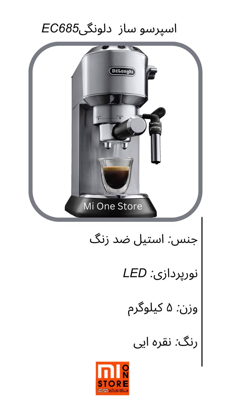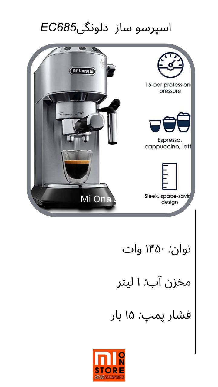 اسپرسو ساز دلونگی مدل EC685 دارای طراحی زیبا و مدرن است که به آشپزخانه شما زیبایی می‌بخشد  این دستگاه کار را برای شما آسان می کند و می تواند مقدار مناسبی از اسپرسو را تولید کند.  اسپرسو ساز دلونگی EC685 دارای سیستم اسپرسو قدرتمندی است که به شما امکان می‌دهد اسپرسویی با طعم و اصالت ایتالیایی را در خانه خود تهیه کنید. Delonghi EC685.M DEDICA 15-Bar Pump Espresso Machine Coffee Maker به شما این قدرت را می دهد که مانند کافی شاپ مورد علاقه خود، نوشیدنی های معتبر با کیفیت باریستا را دم کنید.ما استفاده از این دستگاه را به شما پیشنهاد می گنیم.