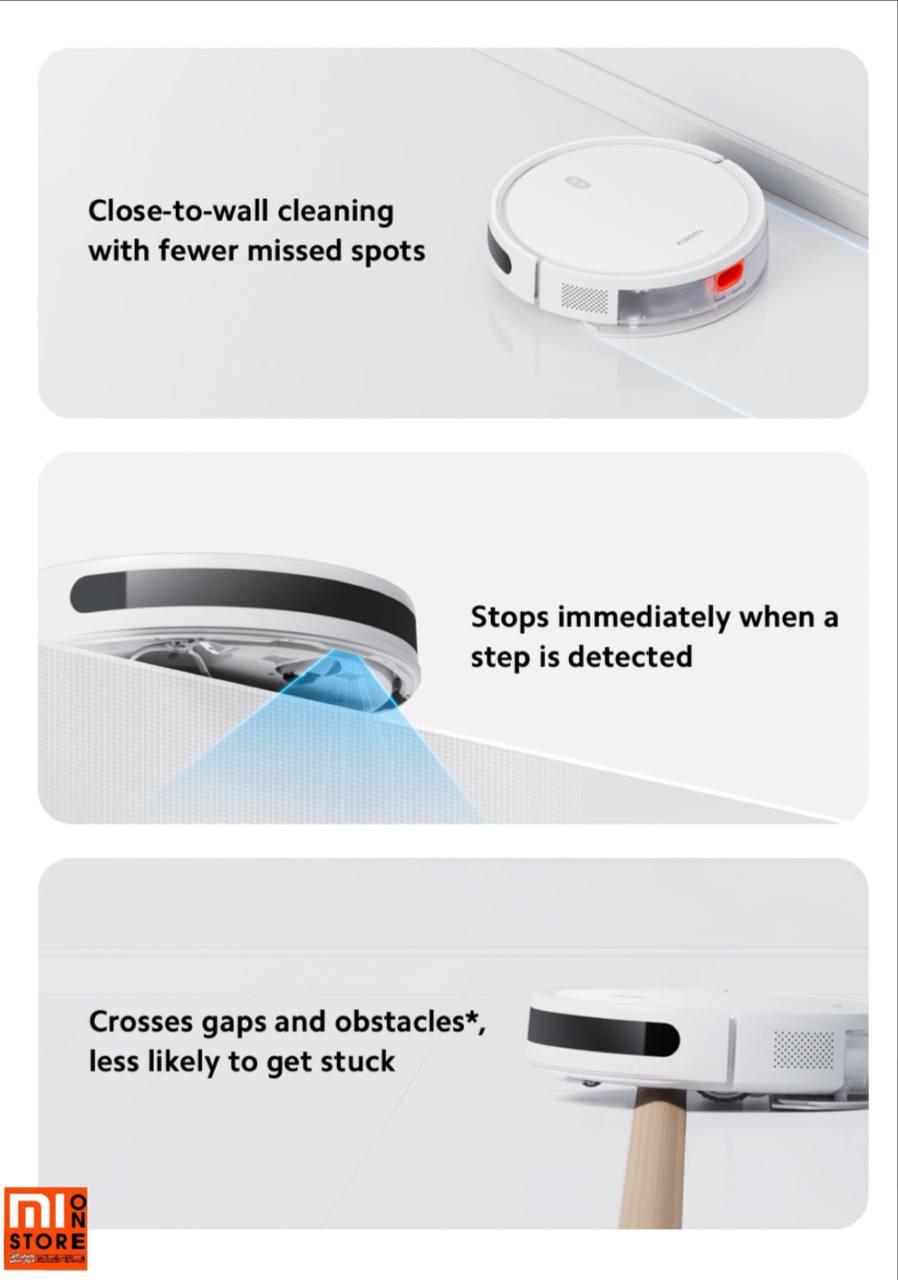• جارو رباتیک E10 می تواند مکان هایی که دسترسی بهشون مشکل است و یا مکان های نزدیک به دیوار را به راحتی تمیز نماید این ربات هنگامی که تشخیص می دهد احتمال دارد سقوط کند بلافاصله متوقف می شود این دستگاه به راحتی از موانع رد می شود و خانه یا محل کار شما را تمیز می کند.