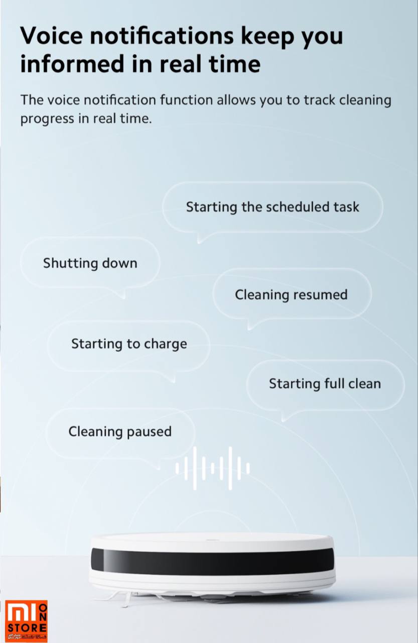 • عملکرد اعلان صوتی به شما امکان می دهد پیشرفت تمیز کردن را در زمان واقعی ردیابی کنید.شما با اغلان صوتی می توانید این موارد را از جارو رباتیک تان بخواهید: شروع کار برنامه ریزی شده، خاموش شدن، شروع به شارژ شدن، نظافت از سر گرفته شد، شروع تمیزی کامل، تمیز کردن متوقف شد.