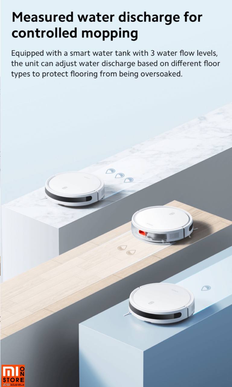 • جاروبرقی رباتیک شیائومی مدل E10قادر است مقدار تخلیه آب را اندازه گیری و کنترل نماید بدین صورت که آب برای شستشوی سطوح مختلف را کنترل شده و بسته به میزان احتیاج آزاد نماید تا انواع کفپوش ها را از خیس شدن بیش از حد محافظت نماید.
