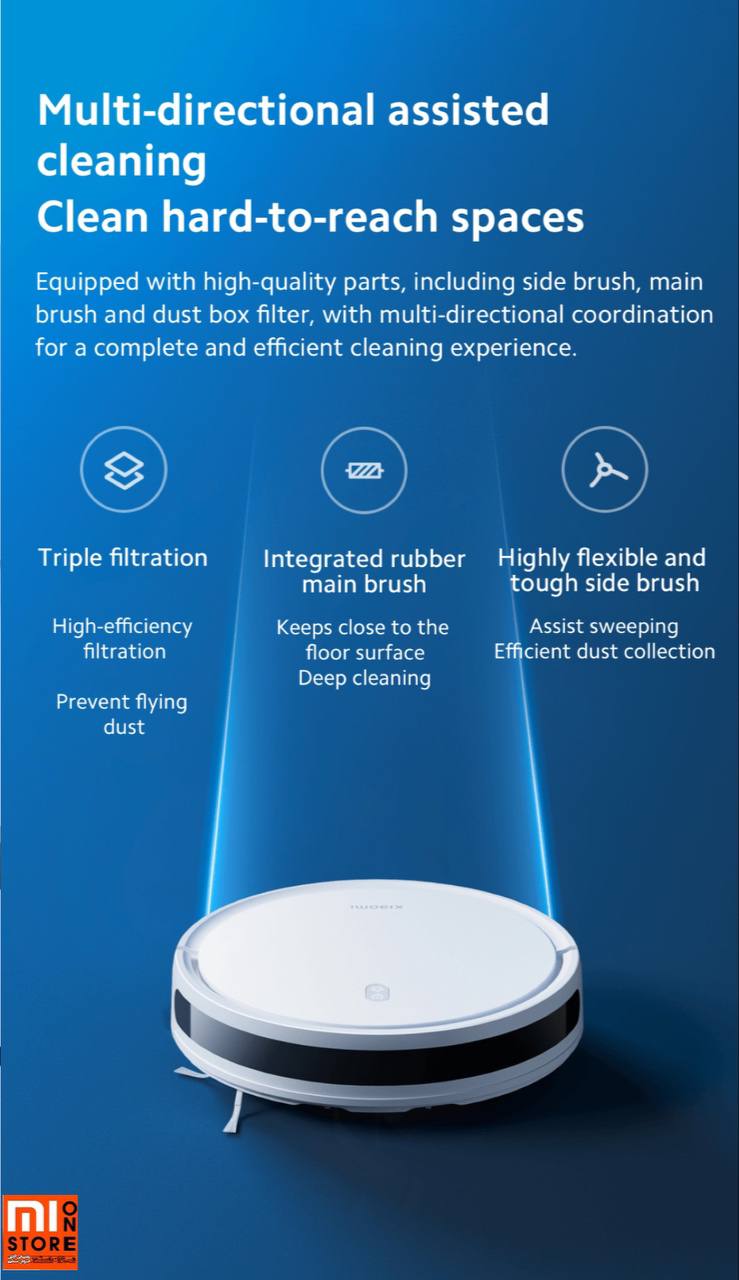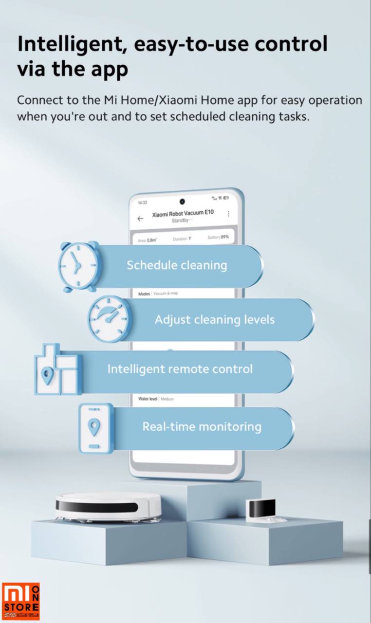 جاروبرقی رباتیک شیائومی مدل E10 می تواند در مناطق مختلف خانه شما حرکت کند و دارای چندین سنسور نیز است. جارو رباتیک E10 از موانع دوری می کند و می تواند مسیری کارآمد برای عملیات خود برنامه ریزی نماید. Xiaomi E10 Robot Vacuum Cleaner می‌تواند به‌روزرسانی‌های صوتی در مورد پیشرفت تمیز کردن ارائه دهد و از طریق برنامه Mi Home قابل کنترل است. همچنین Robot Vacuum E10 از دستورات صوتی Amazon Alexa یا Google Assistant پشتیبانی می کند. ما استفاده از این جارو رباتیک هوشمند را به شما توصیه می کنیم.