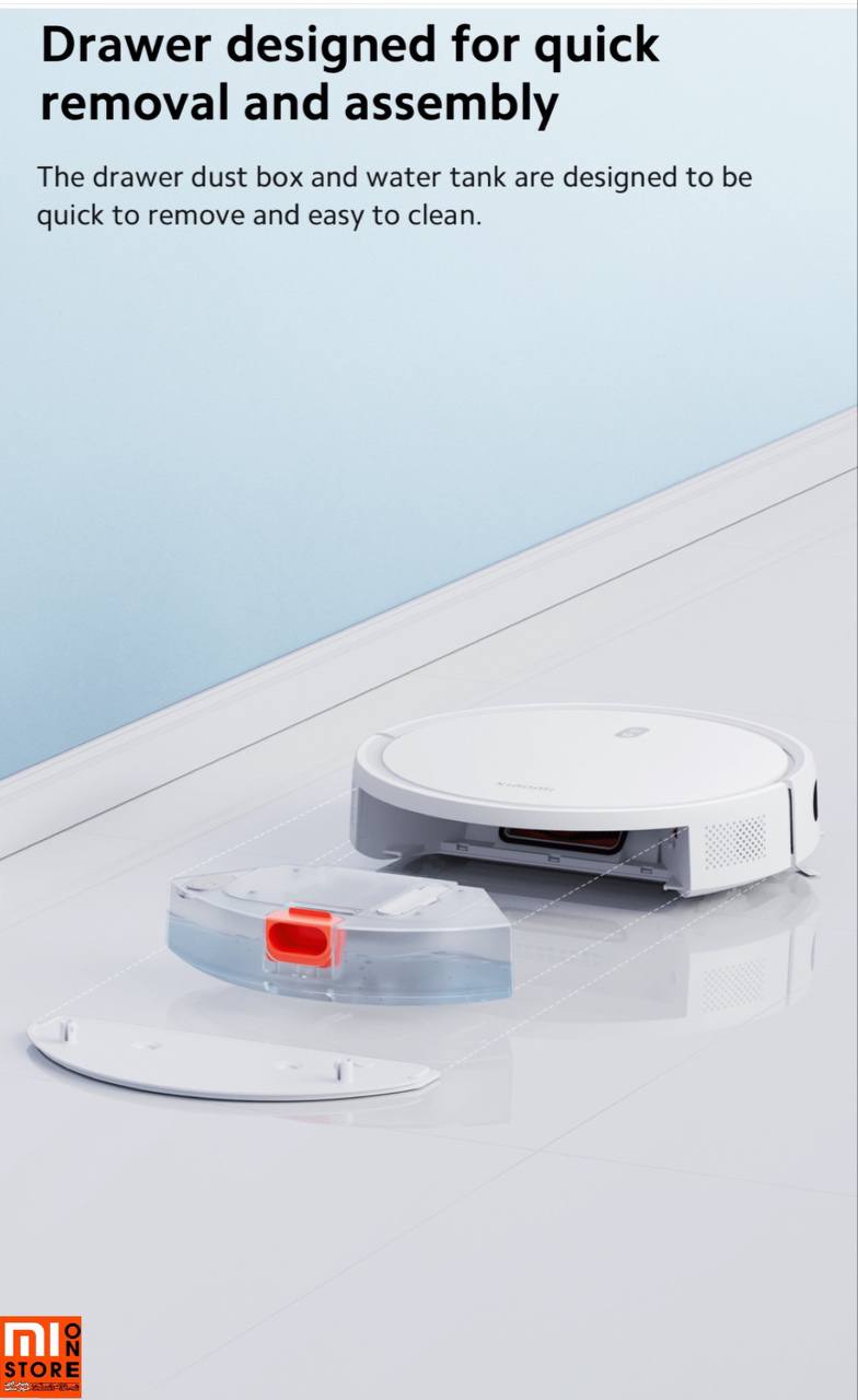 • این جاروی هوشمند دارای کشو است که برای برداشتن و مونتاژ سریع طراحی شده است جعبه گرد و غبار کشو و مخزن آب به گونه ای طراحی شده اند که سریع برداشته شوند و به راحتی تمیز گردند.