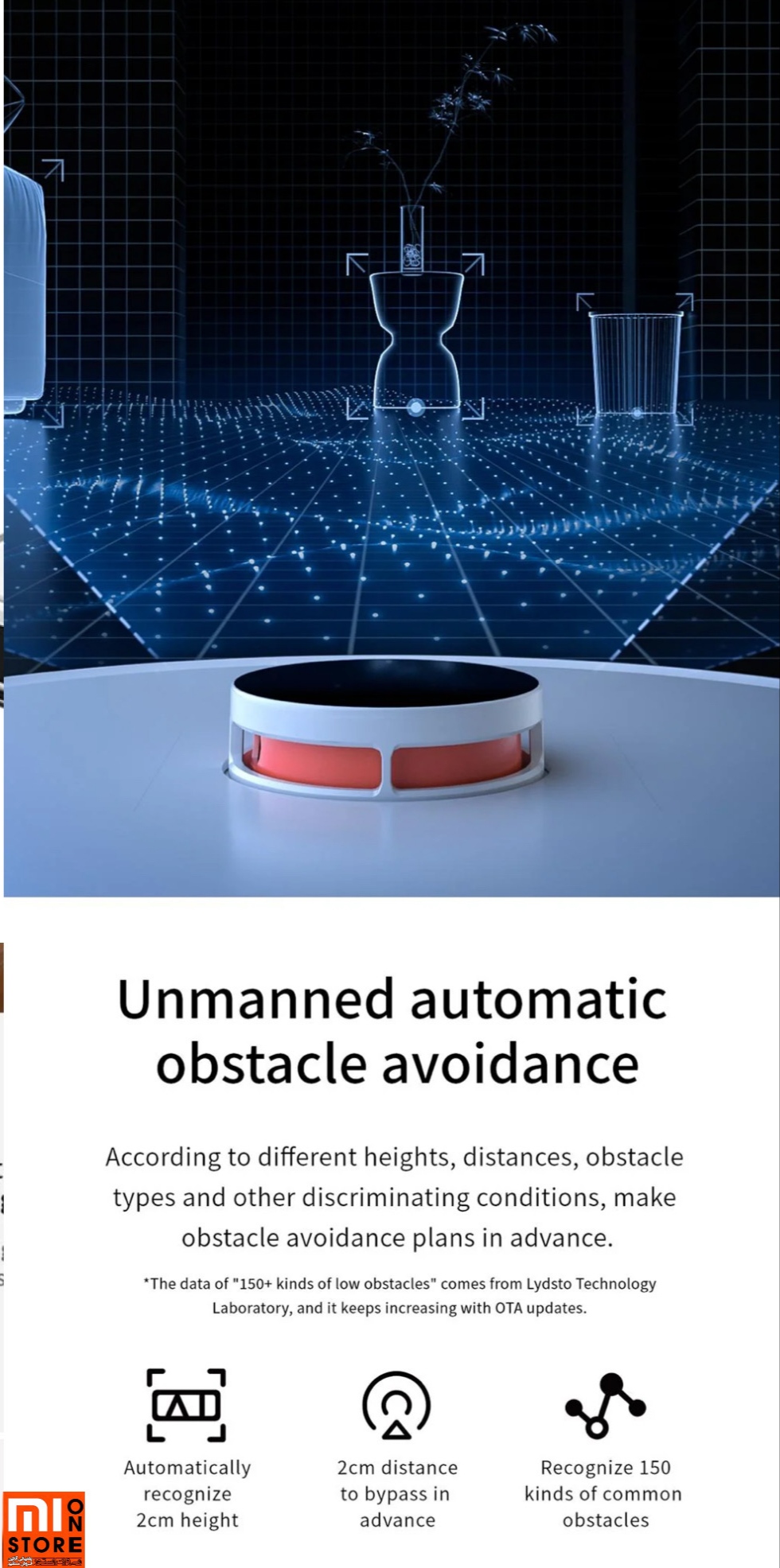 - Lydsto L1 دارای سیستم تشخیص شی و موانع است بدین گونه که اشیاِ بزرگ مانند کفش ورزشی، یک اسباب بازی یا ترازو قادر به تشخیص هستند و به آنها برخورد نمی کنند.