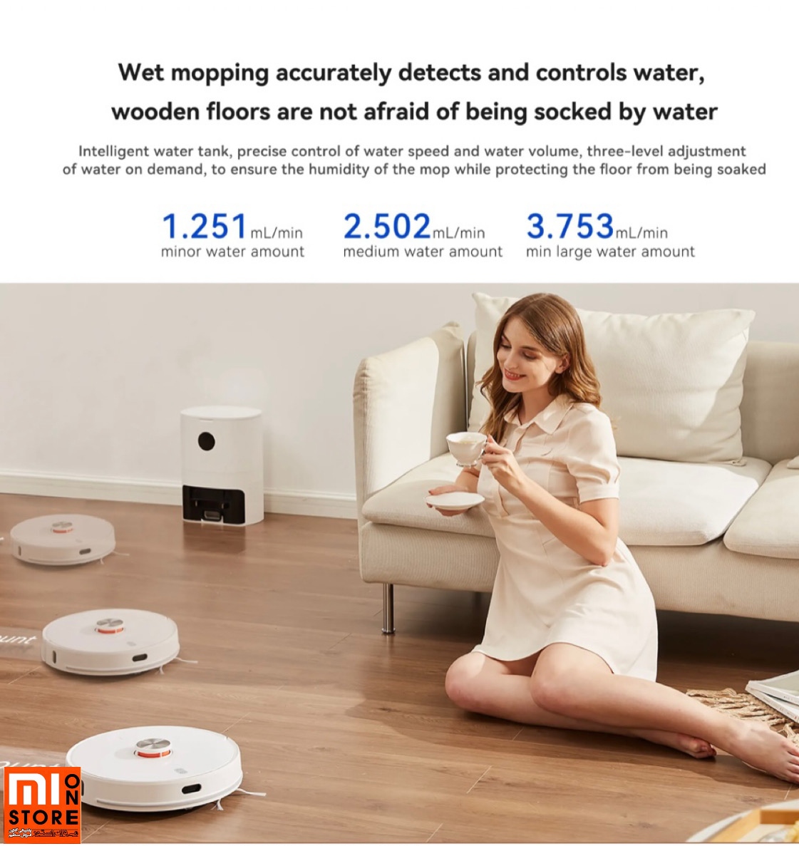 - در این جارو رباتیک شما میتوانید قدرت مکش را برای حالت خودکار تنظیم نماید تا با کل قسمت موجود، مقدار آب روی پارچه را تمیز کنید و حالت شستشوی کف و حالت کاربر را انتخاب نماید.
