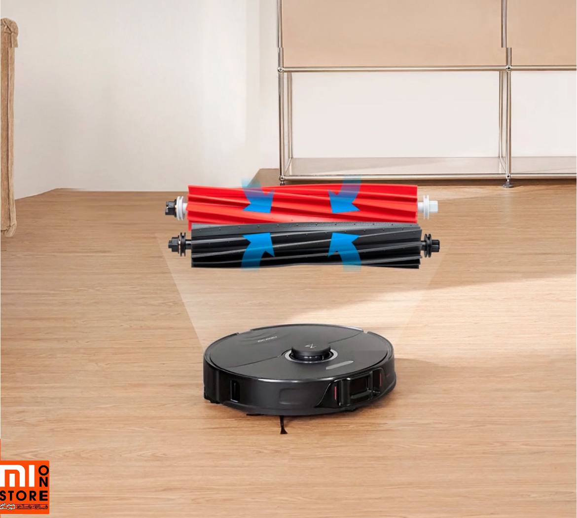 برای قسمت جارو برقی، دستگاه مجهز به دو برس لاستیکی (قرمز و مشکی) دارد که به طور هوشمند در کنار هم قرار می گیرند. برس دوبل این جارو برقی برای جارو کردن و نظافت موثرتر است.