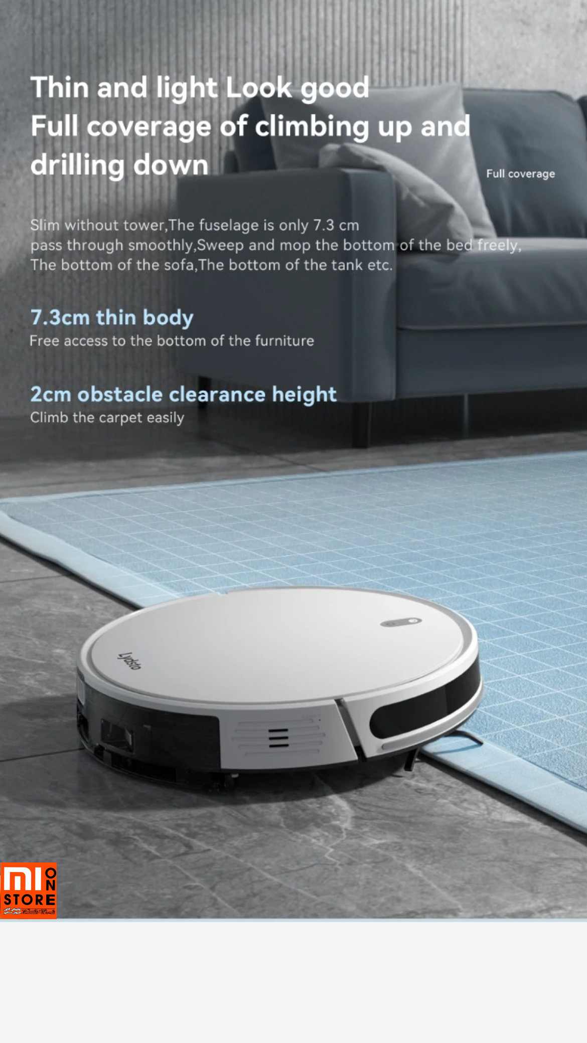 - جارورباتیک هوشمند شیائومی مدل Lydsto R3 دارای ارتفاع حدود 7.3 سانتی متر است که تقریباً می توانند زیر هر مبلمانی مانند کابینت، مبل، تخت، میز بروند و آن مکان ها را تمیز نمایند. این جارو به آسانی به همه جا می تواند برود.