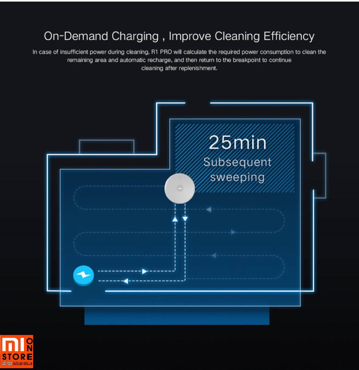 - هنگام تمیز کاری خانه یا محل کارتان در صورتی که شارژش کم باشد، R1 PRO مصرف برق مورد نیاز را برای تمیز کردن قسمت باقی مانده و شارژ مجدد خودکار محاسبه می کند و پس از شارژ شدن مجدد برای ادامه به نقطه شکست برمی گردد.