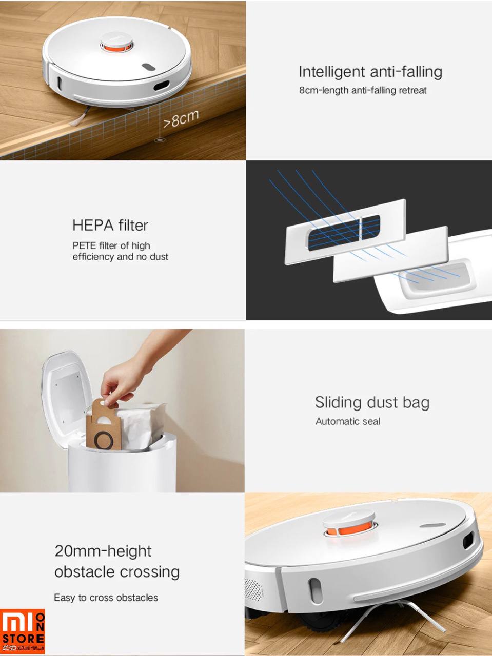 - این جارو هوشمند می تواند از موانع با ارتفاع 20 میلی متر و همچنین از موانع 8 سانتی متر به راحتی عبور کند.