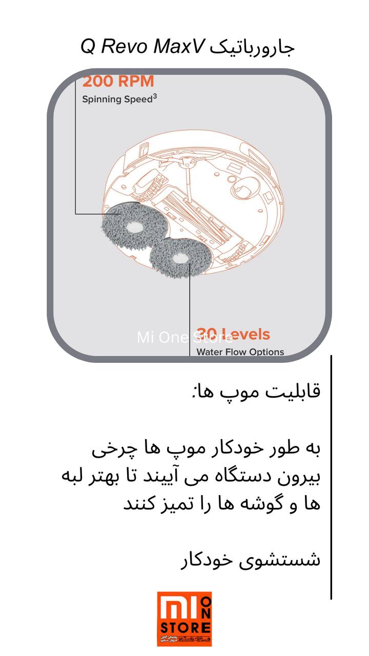 • جارو رباتیک شیائومی Q Revo MaxV دارای دو پد چرخان با قابلیت لیفتینگ موپ می باشد که برای جلوگیری از آلودگی فرش بسیار مناسب است.