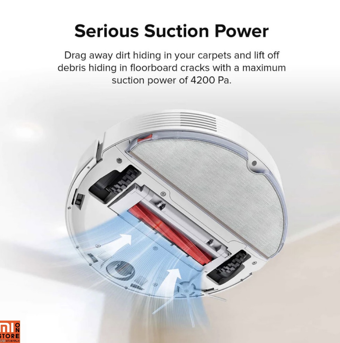 - این ربات قادر است که خاک های پنهان شده در فرش را بیرون آورد و زباله های پنهان شده در شکاف های کف پوش را با حداکثر قدرت مکش 2700 پاسکال از بین ببرید.