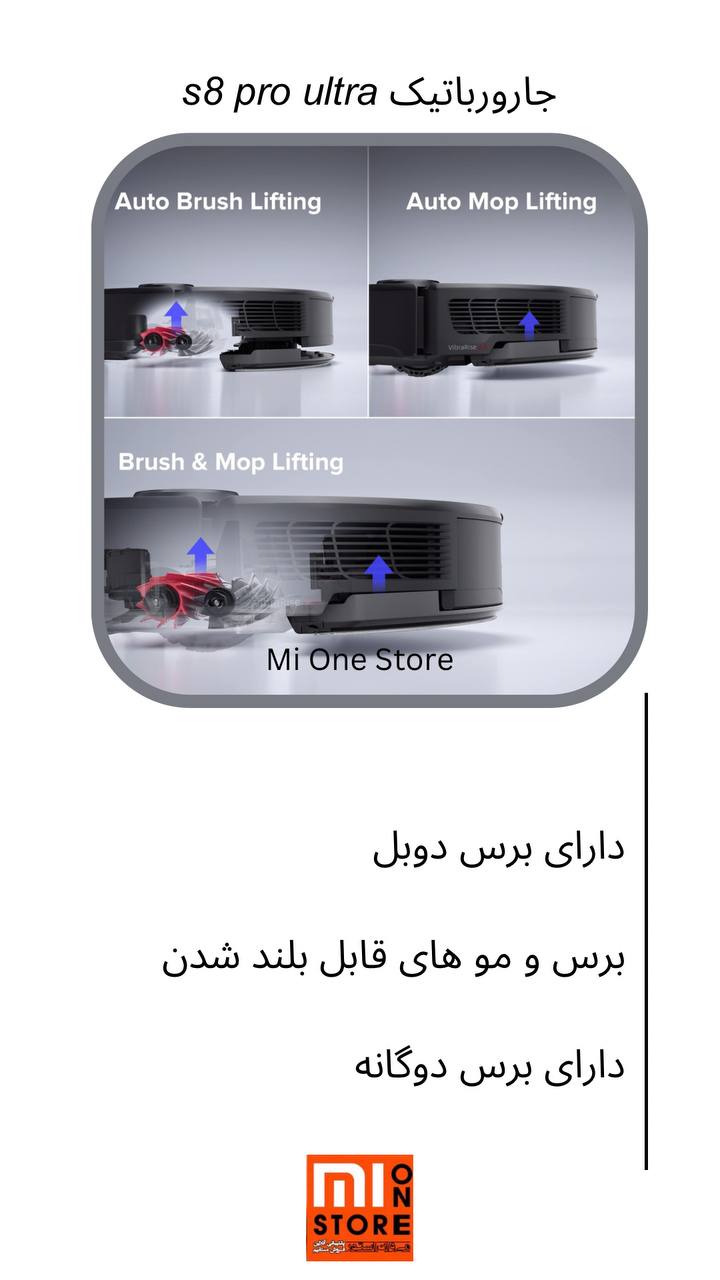 جارو رباتیک شیائومی مدل Roborock S8 Pro Ultra دارای برسها و موپهای قابل بلند کردن هستند که میتوانند جاروبرقی و پاککنی را در یک تمیز کردن جدا کنند، بدین ترتیب می توانند کارایی تمیز کردن را برای کارهای مختلف مانند تمیز کردن فرش و تمیز کردن کف سخت به حداکثر برسانند و قادرند از باقی ماندن لکه پس از تمیز کردن جلوگیری کنند.