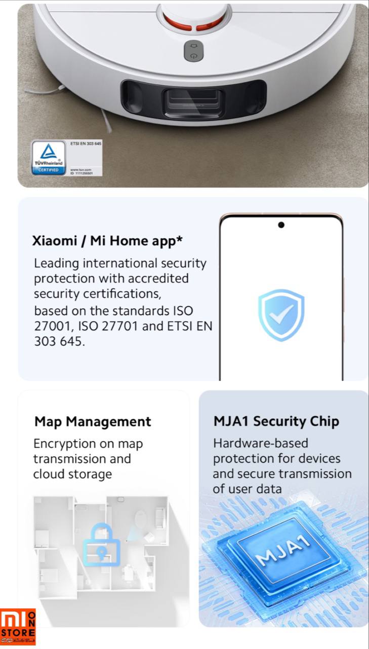 - این ربات حفاظت همه جانبه از امنیت و حریم خصوصی کاربر را انجام می دهد و گواهی استاندارد امنیت سایبری و حفاظت از حریم خصوصی TÜV Rheinland را دارد.