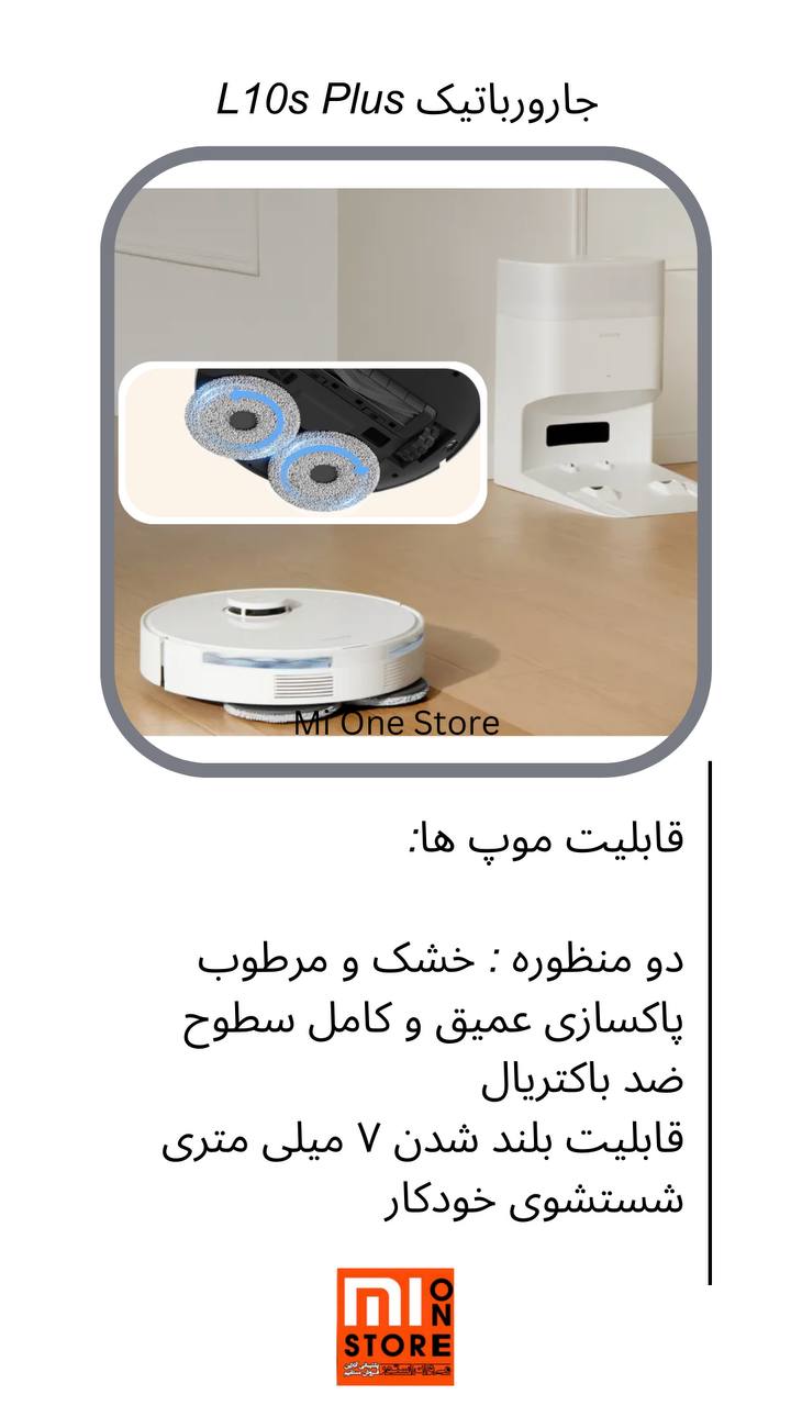 - جارو ربایتک L10 s Plus دارای موپهای دو منظوره می باشد، این موپهای قابل تعویض در جارو رباتیک هستند که به صورت خشک و مرطوب قابل استفاده می باشند. این ویژگی به دستگاه امکان تمیزی دقیقتر و کارآمدتری را میدهد.