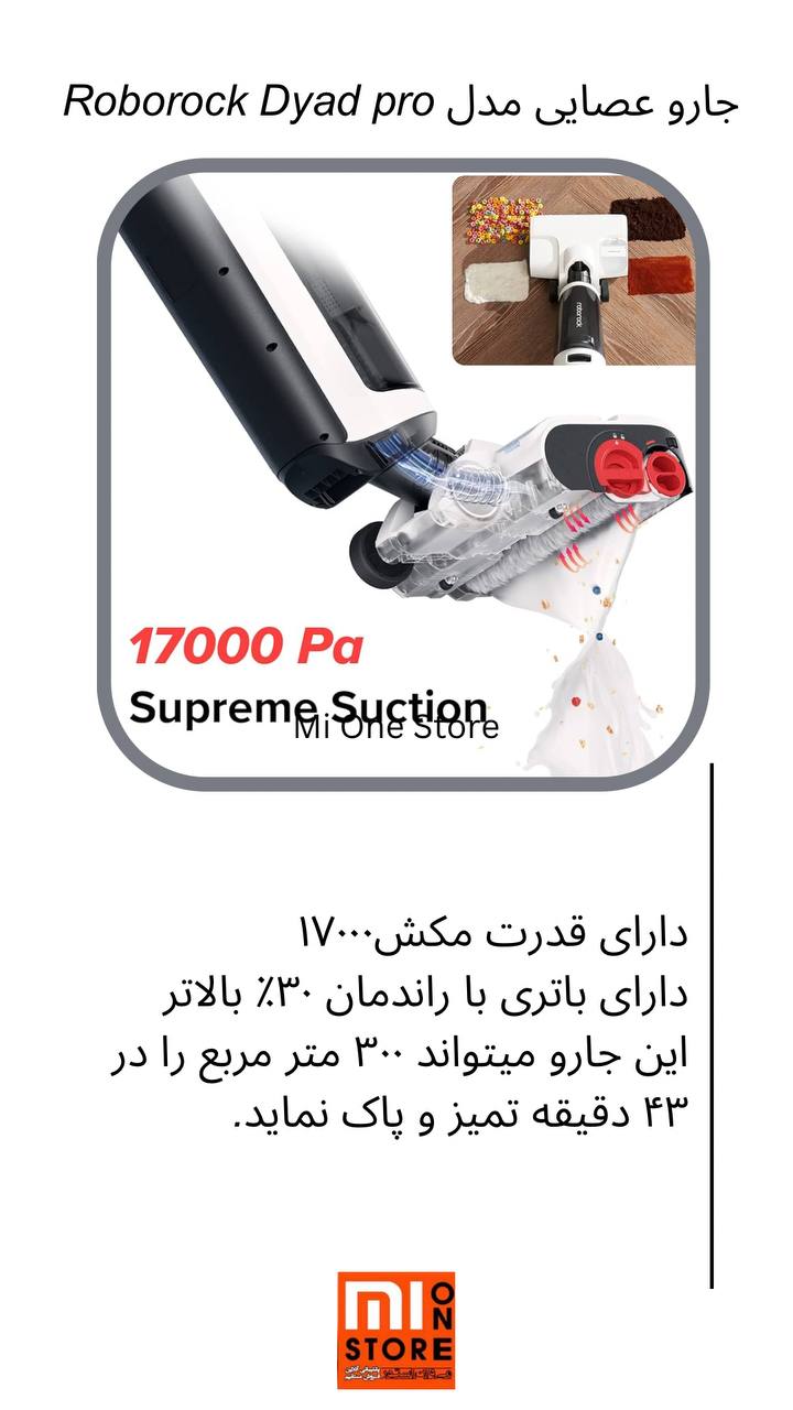 جارو شارژی عصایی شیائومی مدل roborock Dyad Pro دارای قدرت مکش 17000 پاسکال می باشد که می تواند نظافت، تمیزی بهتری به شما ارائه دهد.