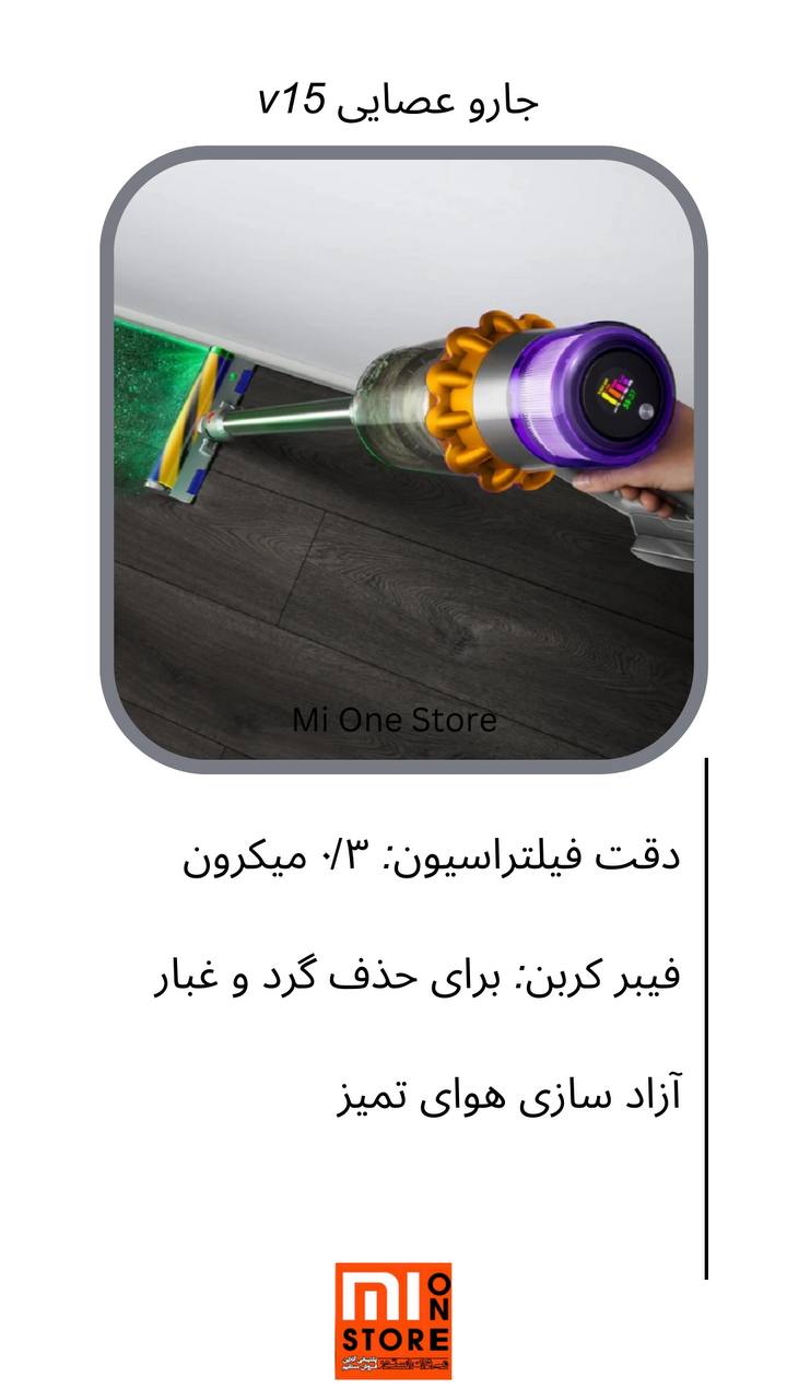 - جارو شارژی V15 Detect دارای فیلتراسیون چند سطحی است بدین ترتیب که سیستم فیلتراسیون کاملاً مهر و موم شده است که Dyson 99.99٪ ذرات میکروسکوپی و آلرژنهای کوچک 0.3 میکرون را جذب میکند و هوای تمیز را آزاد میکند.