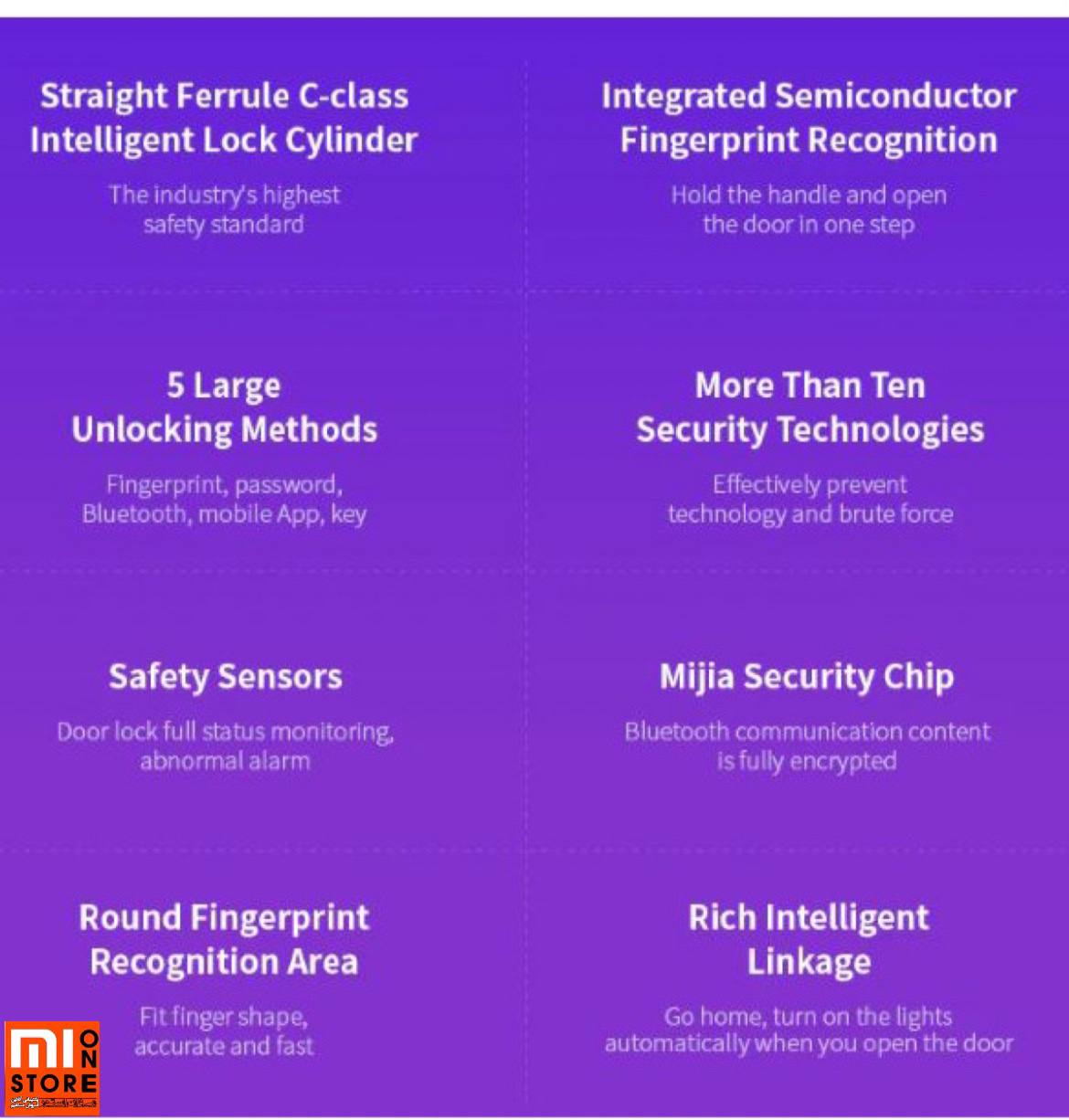 - دستگیره هوشمند دارای فناوری اثر انگشت است که توسط شیائومی از نسل سوم استفاده می کند که دارای دقت 98.94 درصدی است تا بتواند در تشخیص کاربر واقعی بسیار دقیق تر عمل کند.