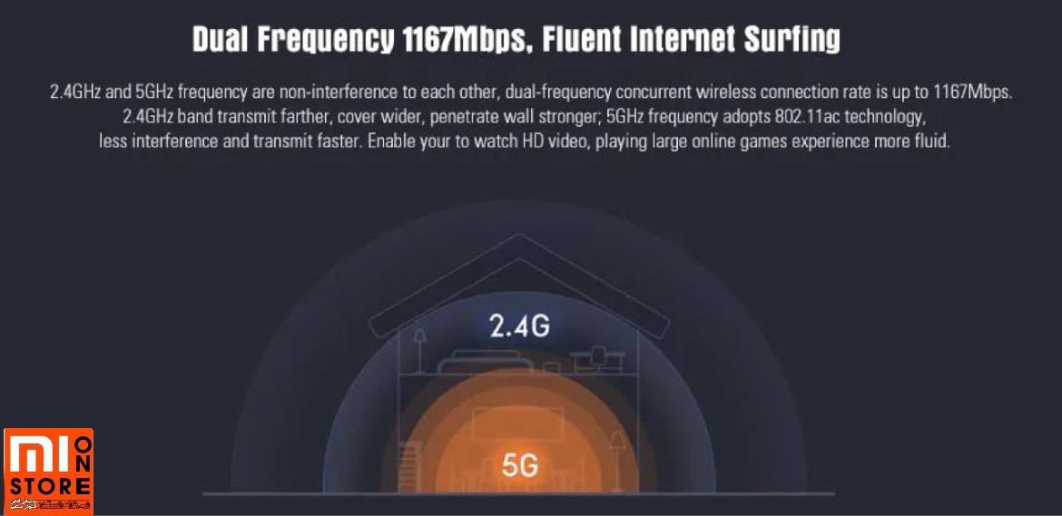 - وای فای روتر 4A شیائومی از اتصال بیسیم دوبانده که همزمان ۲٫۴G / 5G با سرعتی تا ۱۱۶۷Mbps پشتیبانی میکند که متعلق به رده روتینگ AC1200 هست.