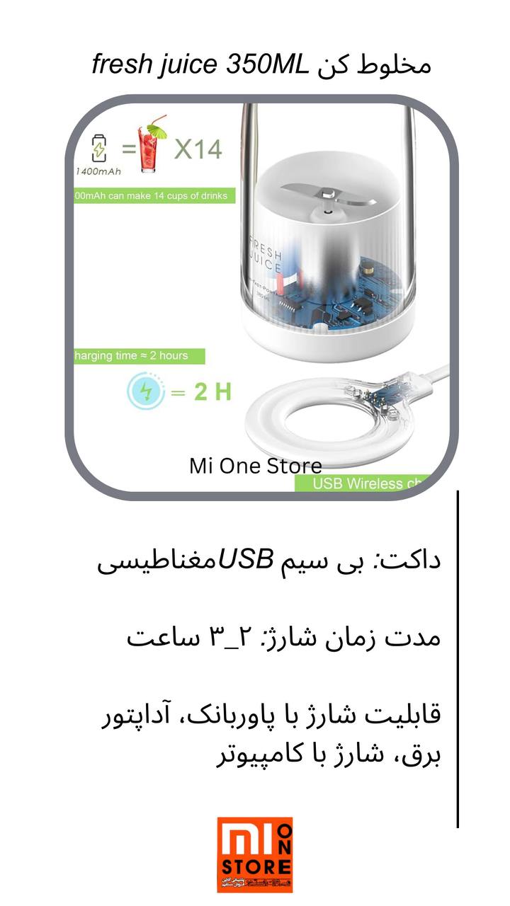 - مخلوط کن و اسموتی ساز Fresh Juice 350ML دارای یک داک شارژ بی سیم (USB) است تا بتوانید بدون نگرانی از سیم دستگاه را شارژ کنید!