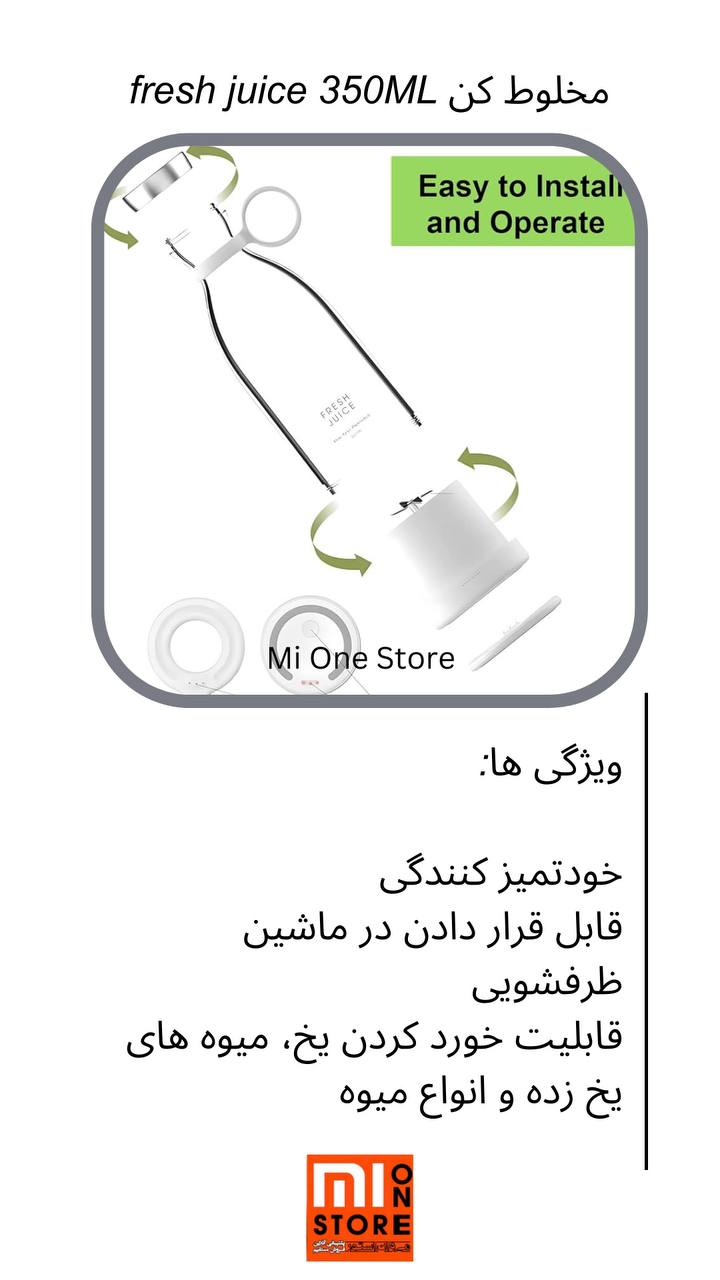 - این مخلوط کن Fresh Juice 350ML، مخلوط کن و بطری است یعنی بطری 2 در 1 در نتیجه شما می توانید با این دستگاه اسموتی و آبمیوه غنی از مواد مغذی را در هر جایی که دوست دارید ایجاد کنید.