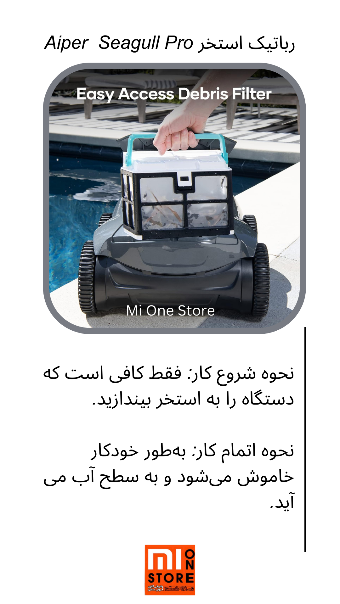 - برای استفاده از جاروی رباتیک Aiper Seagull Pro، کافی است دستگاه را به استخر بیندازید و آن را روشن کنید. این ربات بهطور خودکار کار خود را شروع میکند و نیاز به کنترل دستی ندارد.