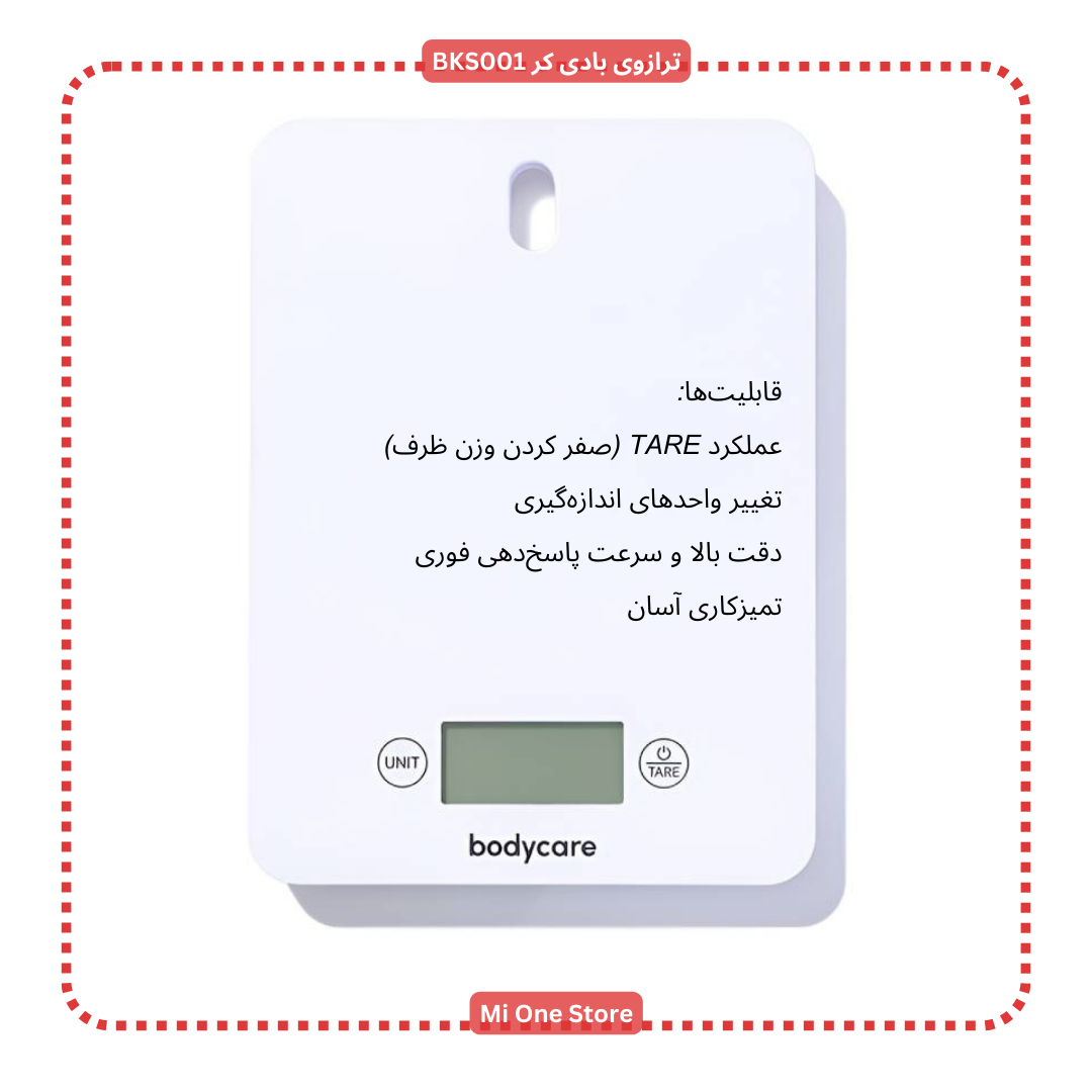 ترازوی آشپزخانه BodyCare مدل BKS001، با طراحی زیبا و عملکرد دقیق، انتخابی مناسب برای آشپزخانه‌های مدرن است. این ترازو با ویژگی‌های منحصر به فرد خود، تجربه‌ای راحت و کارآمد در اندازه‌گیری مواد غذایی فراهم می‌کند. ترازوی بادی کر BKS001 دارای طراحی باریک، وزن سبک و عملکرد دقیق می باشد. BodyCare Digital Kitchen Scale – Model BKS001 دارای دکمه UNIT می باشد تا شما بتوانید واحد اندازه‌گیری را به‌دلخواه خود تغییر دهید، مثلاً از گرم به اونس یا میلی‌لیتر برای مایعات تبدیل نماید. این ویژگی ترازو را برای دستورهای آشپزی بین‌المللی کاملاً مناسب می‌سازد. ما استفاده از این ترازو دیجیتال را به شما پیشنهاد می کنیم.