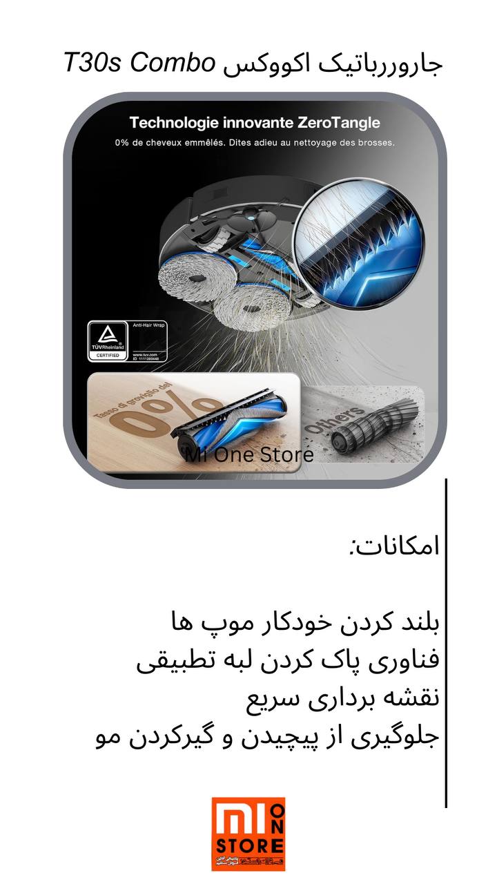 - جارو رباتیک T30S COMBO دارای 4 سر برس مختلف است که شامل ابزار شکاف، برس گردگیری، برس مینی پاور و برس برقی ZeroTangle میباشد.
