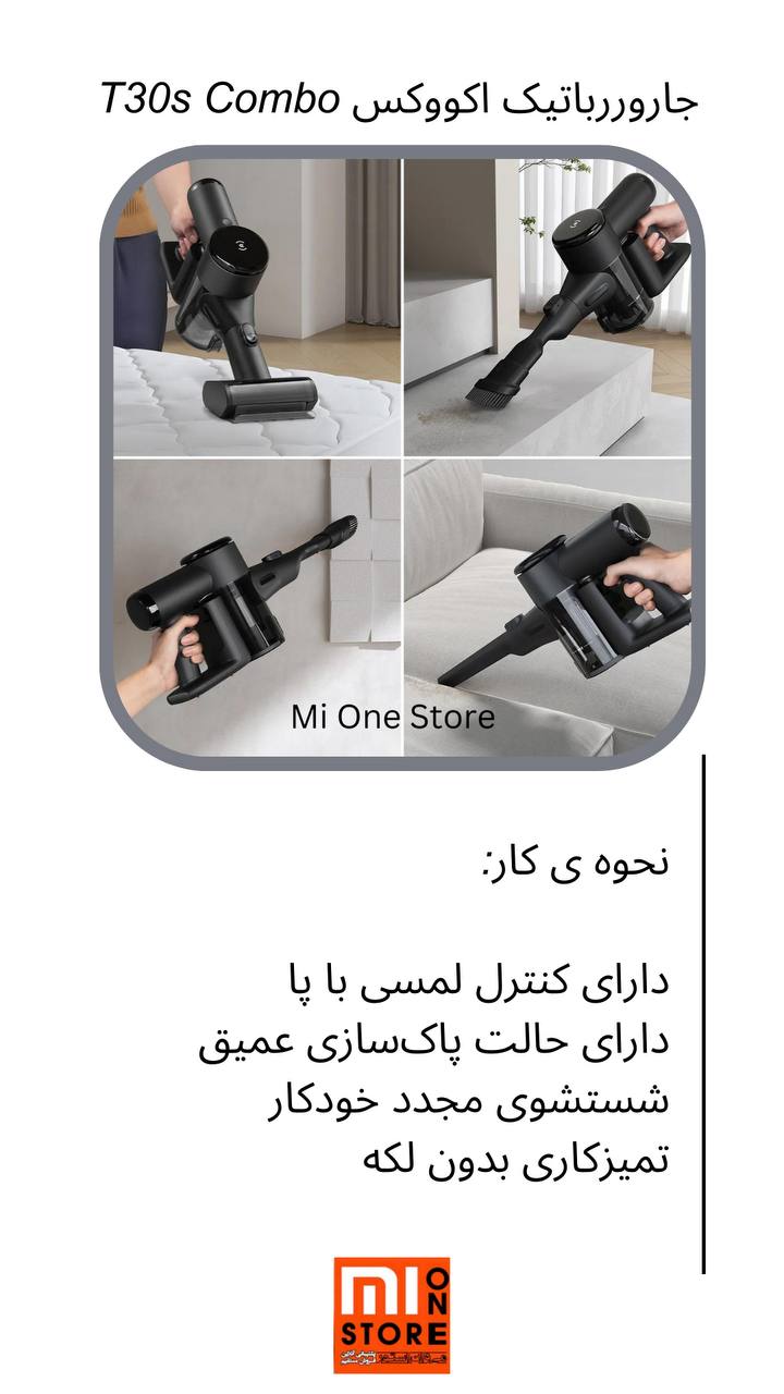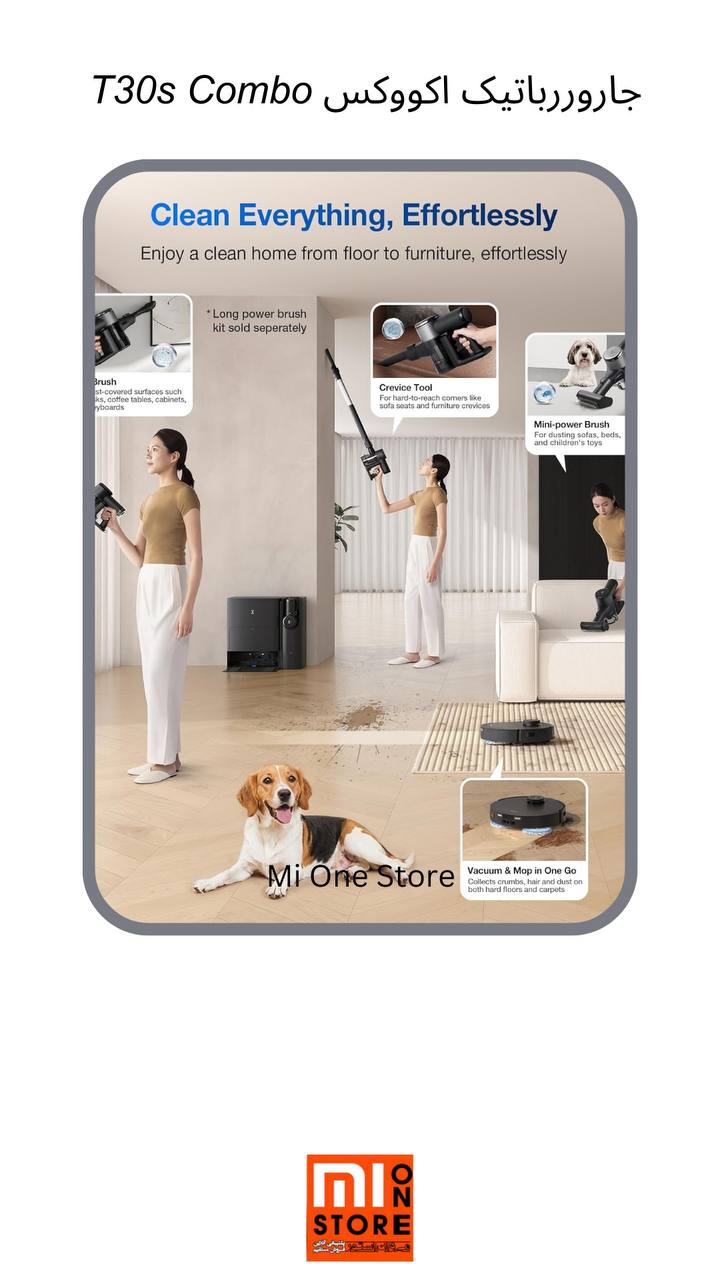 - این جارو رباتیک اکووکس مدل T30S COMBO دارای جارو برقی دستی جداگانهای است که برای تمیز کردن چند سطح، از جمله مبلها و پلهها طراحی شده است.