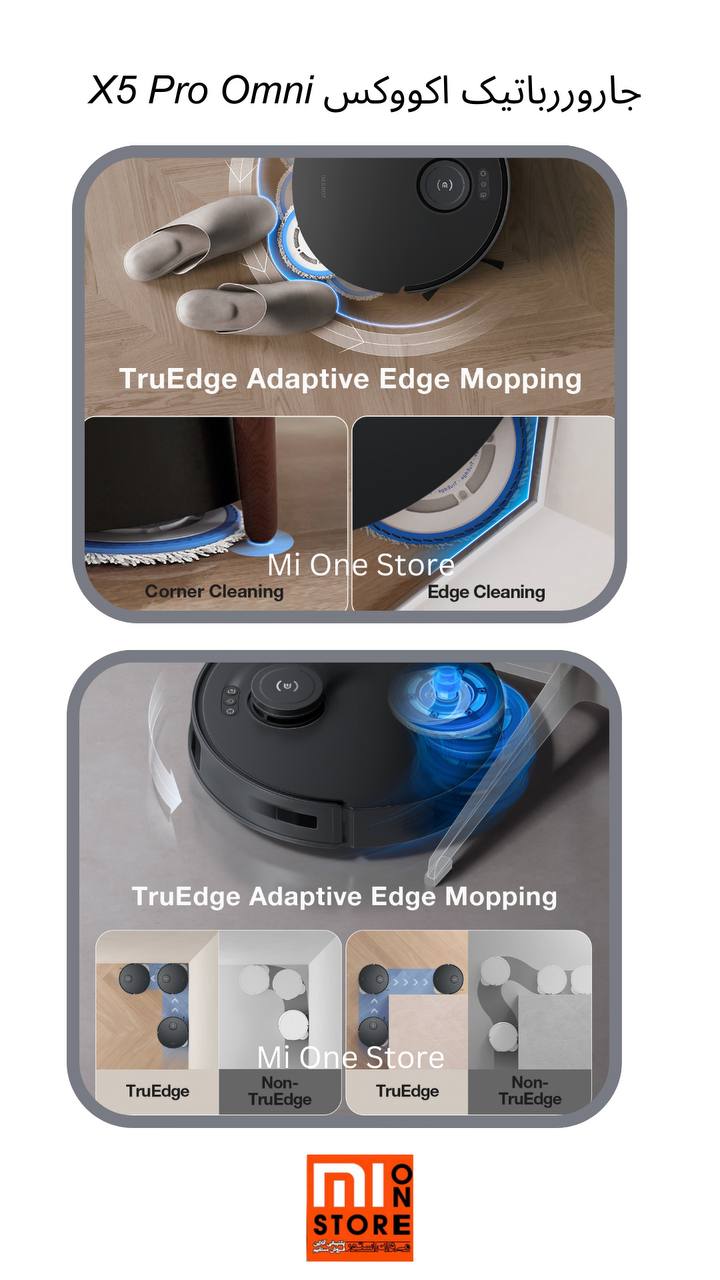 - TruEdge با فاصله 1 میلیمتری از دیوارها و موانع، پوشش 100% تمیزکاری جاروبرقی و پاککن را تضمین میکند.
