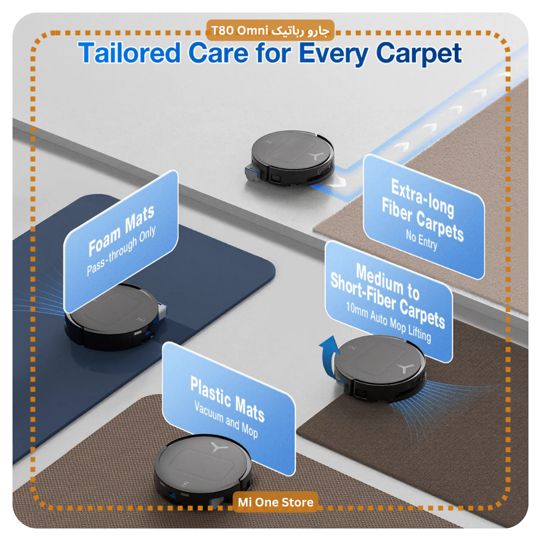 جارو رباتیک T80 Omni دارای تشخیص خودکار فرش و انتخاب حالت مناسب میباشد. با اولویتدهی به فرش، ابتدا با تی خشک آن را جارو میکشد تا از خیس شدن جلوگیری شود. سپس با سنسور هوشمند، نوع فرش را تشخیص داده و از میان حالتهای مختلفی مانند: فقط جاروبرقی، ورود ممنوع، فقط عبور، تمیزکاری عادی گزینه مناسب را انتخاب میکند.