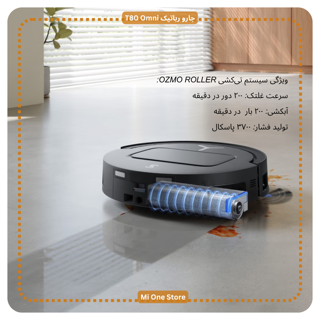 جارو رباتیک T80 Omni دارای سیستم تیکشی OZMO ROLLER میباشد که با تولید فشار ۳۷۰۰ پاسکال، قدرتی ۱۶ برابر بیش از تیکشیهای تخت یا دو صفحهای ایجاد میکند. غلتک این سیستم با سرعت ۲۰۰ دور در دقیقه، معادل ۲۰۰ بار آبکشی در دقیقه، بهصورت همزمان لکهها را از بین برده و از آلودگی متقاطع جلوگیری میکند.