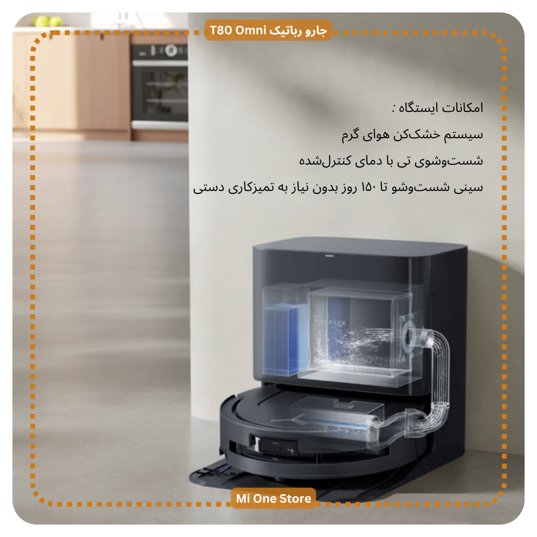 جارو رباتیک T80 Omni دارای شستوشوی تی با دمای کنترلشده میباشد. دستگاه امکان شستوشوی تی با دمای ۴۰ تا ۷۵ درجه سانتیگراد را با توجه به میزان آلودگی فراهم میکند و آن را مطابق با نوع اتاق تنظیم مینماید. این دستگاه دارای سیستم خشککن هوای گرم است که در دمای ۴۵ درجه سانتیگراد و با طراحی ۳۶۰ درجهای، تی در عرض ۲ ساعت کاملاً خشک میشود و از ایجاد بوی ناخوشایند جلوگیری مینماید.