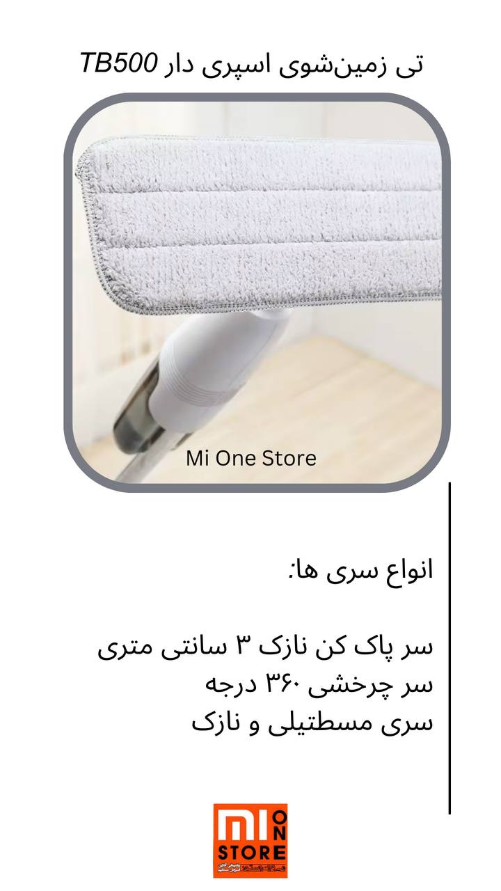 - تی زمین شوی اسپری دار TB500 دارای سر چرخشی 360 درجه است که برای تمیز کردن گوشههای صعب العبور به راحتی میچرخد و می تواند اسپری 95 سانتیمتری برای مسافتهای طولانی تمیز کردن نرمی را ارائه دهد.