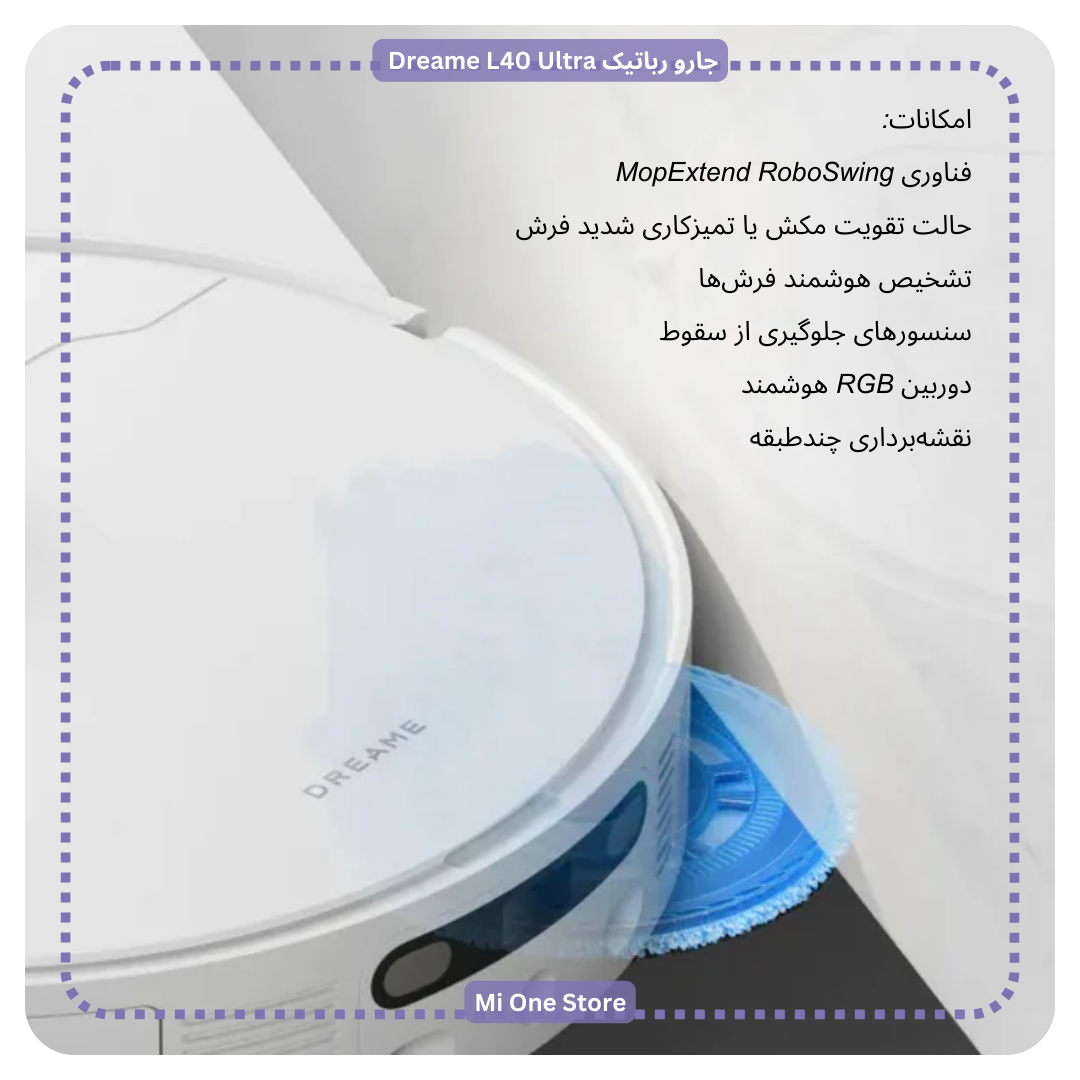 جارو رباتیک شیائومی مدل Dreame L40 Ultra دارای فناوری MopExtend RoboSwing می باشد بدین ترتیب که این فناوری به جارو امکان میدهد تا با حرکتهای دقیق و کنترل شده، به عمق ۴ سانتیمتری در فضاهای تنگ مانند گوشهها و زیر مبلمان نفوذ کرده و تمیزکاری مؤثری انجام دهد.