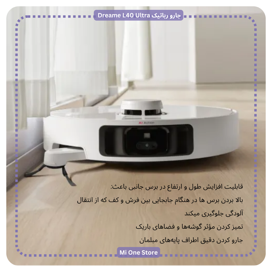 جارو رباتیک دریم l40 ultra دارای برس جانبی قابل تنظیم می باشد که برای تمیز کردن مؤثر گوشهها و فضاهای باریک مناسب است.