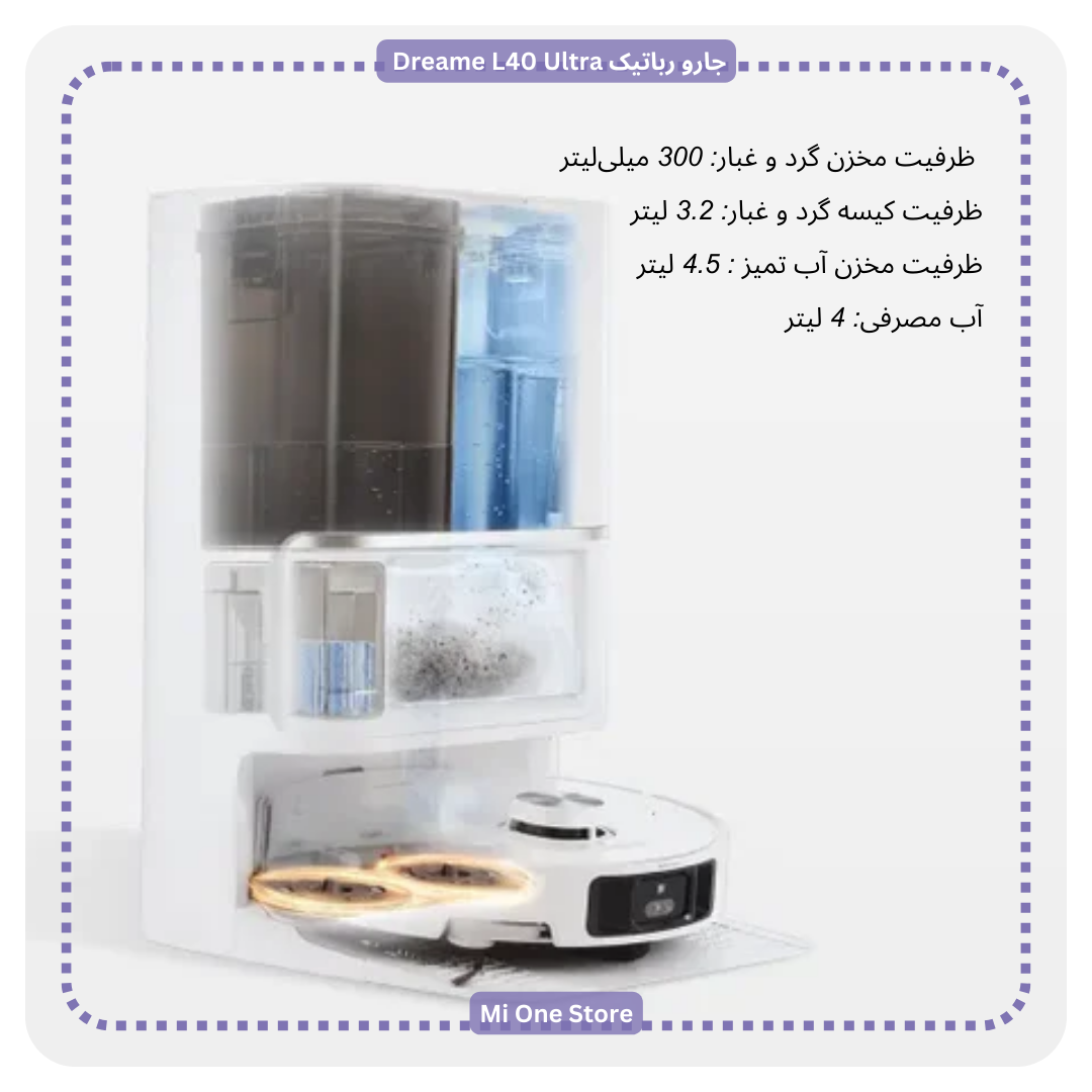 جارو هوشمند دریم مدل L40 Ultra دارای ظرفیت مخازن آب می باشد بدین ترتیب که 4.5 لیتر آب تمیز و 4 لیتر آب مصرفی است.