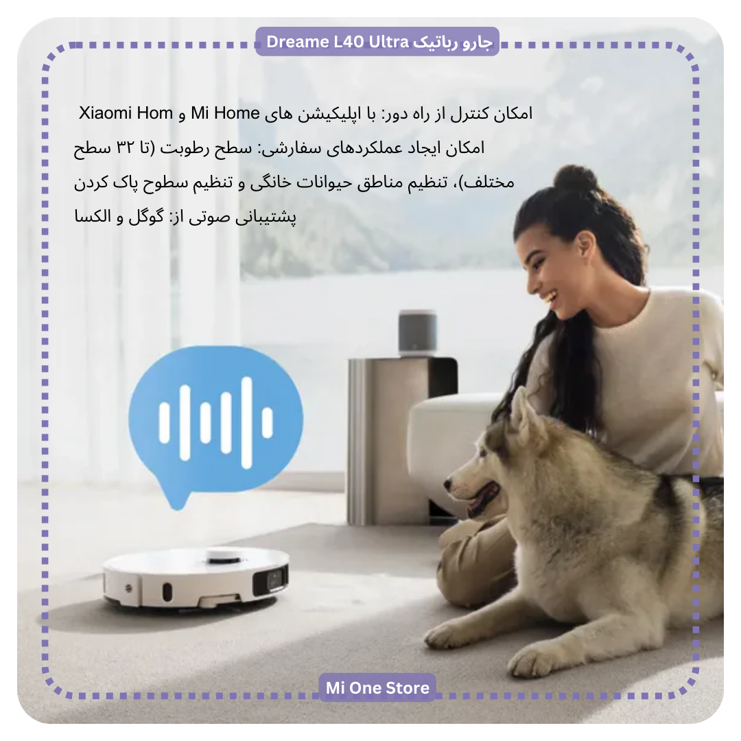 این دستگاه Dreame L40 Ultra Robot Vacuum از دستیارهای صوتی مانند Alexa، Siri و Google پشتیبانی میکند که امکان کنترل صوتی را فراهم میسازد.
