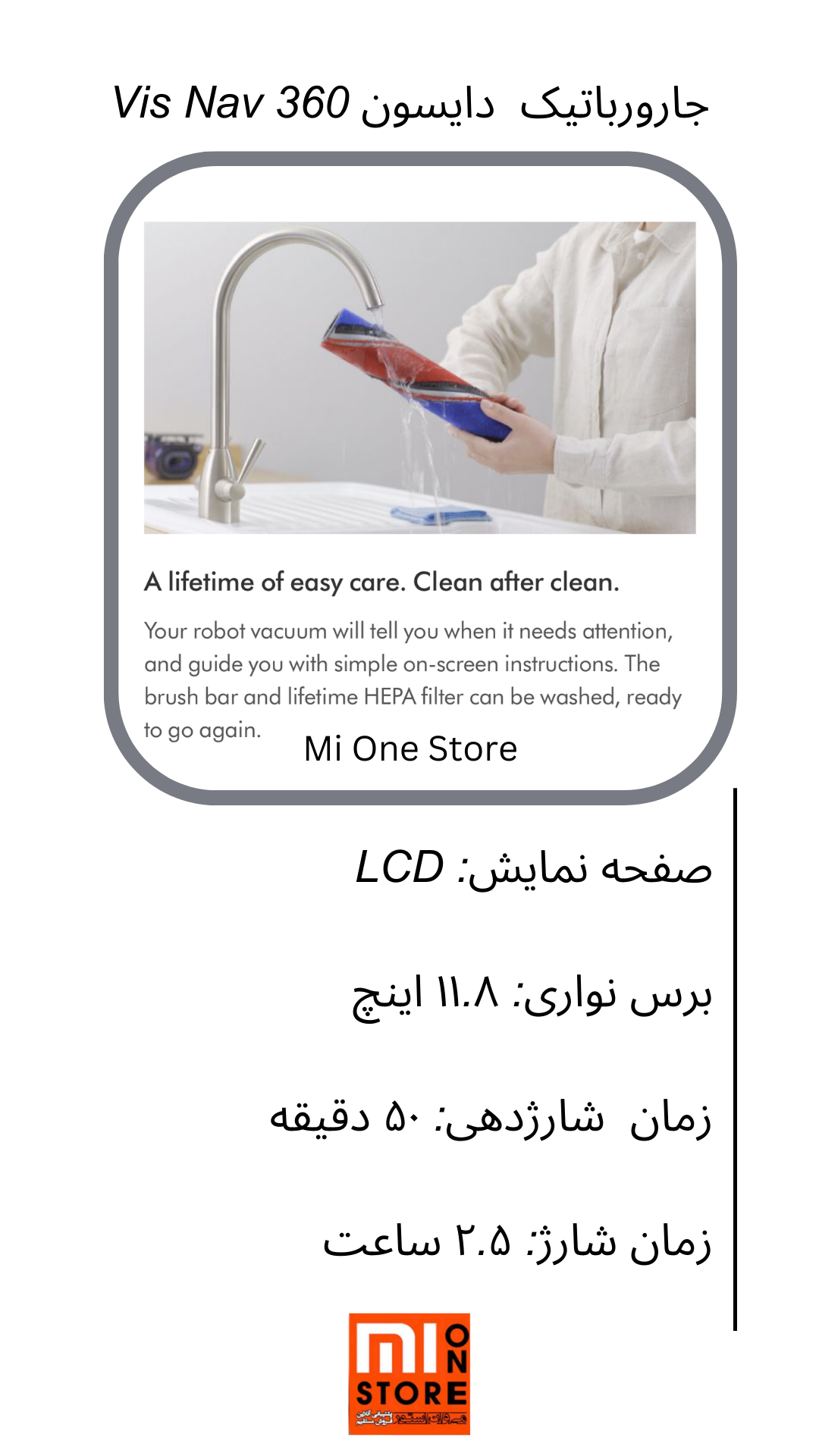 - این ربات زمانی که نیاز به توجه دارد به شما می گوید و با دستورالعمل های ساده روی صفحه LCD، شما را راهنمایی می کند. مثلا سطل زباله را با یک اقدام بهداشتی خالی کنید. نوار برس و فیلتر طول عمر قابل شستشو هستند و آماده استفاده مجدد می باشند.