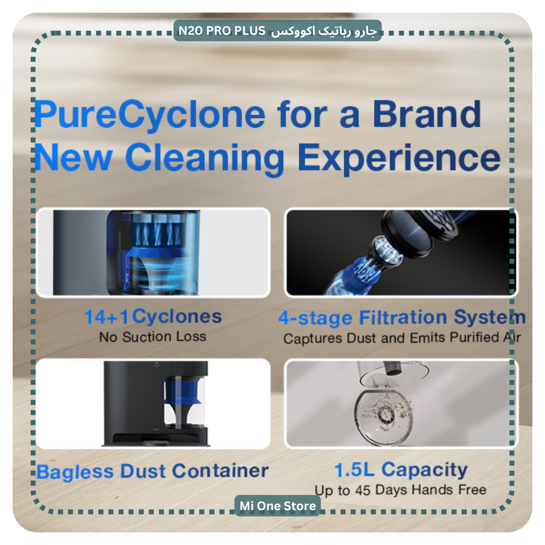 • جارو رباتیک هوشمند دارای تمیز کردن با فناوری ECOVACS PureCyclone و سیستم تصفیه 4 مرحله‌ای می باشد.