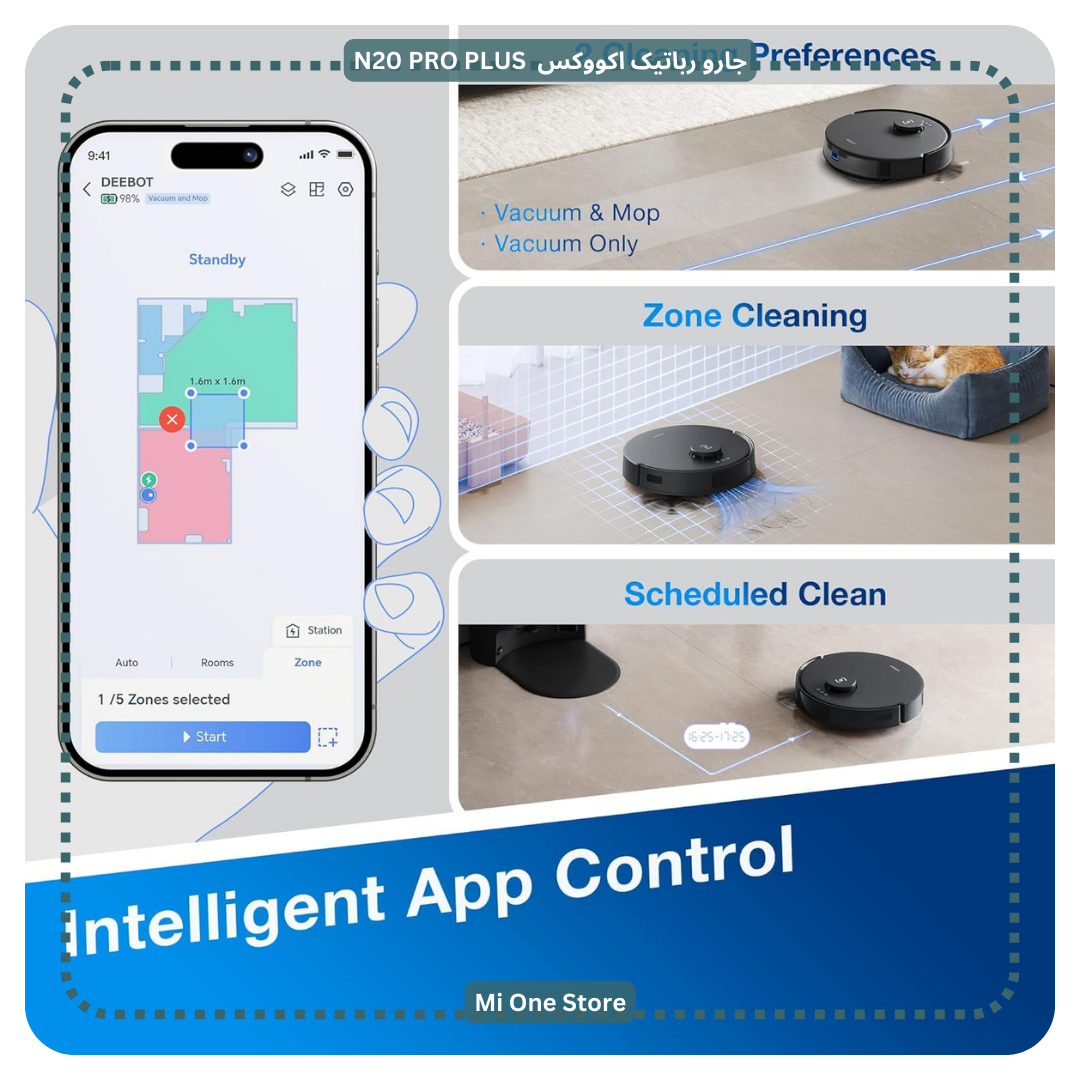 • نقشه‌های ایجاد شده در اپلیکیشن ECOVACS HOME ذخیره می‌شود و امکان تنظیم مناطق مختلف برای تمیزکاری یا جلوگیری از ورود به بخش‌های خاص را فراهم می‌کند.
