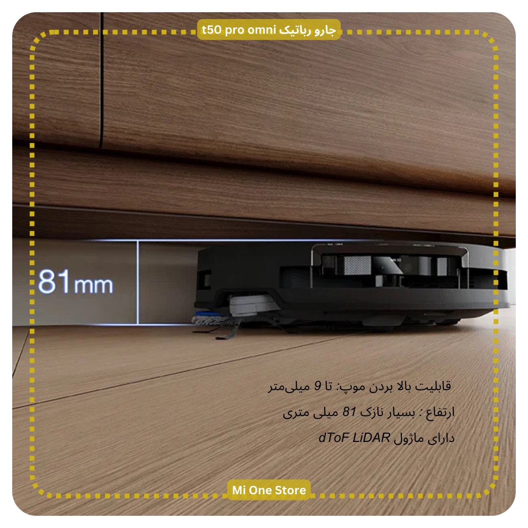 جارو رباتیک اکووکس t50 pro omni دارای طراحی بسیار نازک 81 میلی متری است که می توند با ماژول dToF LiDAR به طور یکپارچه در زیر مبلمان کم ارتفاع و در مناطقی که دسترسی به آن ها سخت است حرکت کند و محیط را تمیز نماید و پوشش و کارایی تمیز کردن را افزایش دهد.