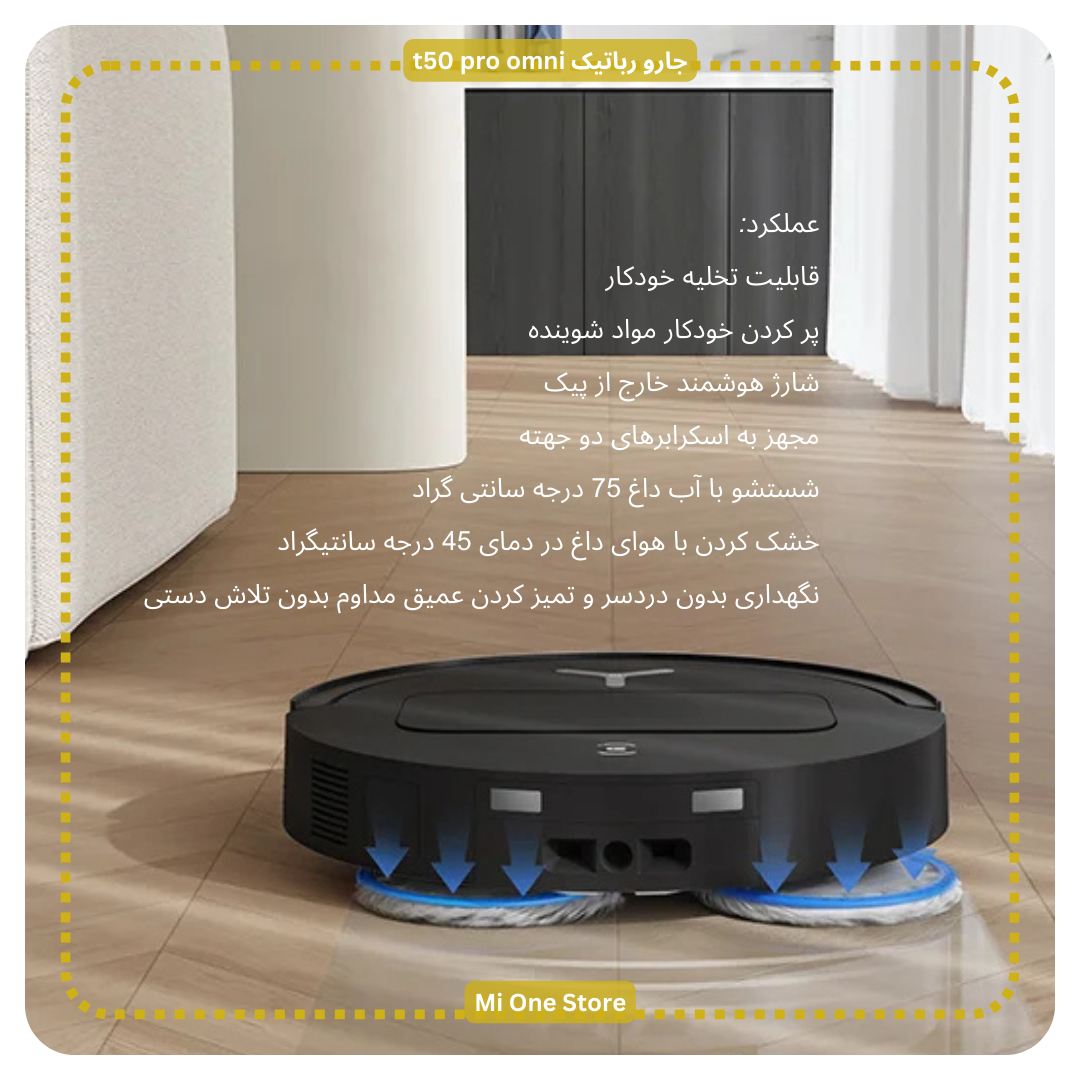 - جارو رباتیک t50 proدارای قابلیت تخلیه خودکار، خشک کردن هوای داغ در دمای 45 درجه سانتیگراد، پر کردن خودکار مواد شوینده (𝐧𝐞𝐰) و شارژ هوشمند خارج از پیک.