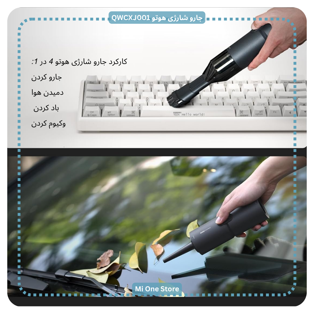 - جارو شارژی هوتوQWCXJ001 دارای طراحی دو کاره است بدین ترتیب که از جاروبرقی دستی دو کاره برای ماشین می توانید استفاده کنید که هم مکش و هم دمیدن هوا را امکان پذیر می کند.