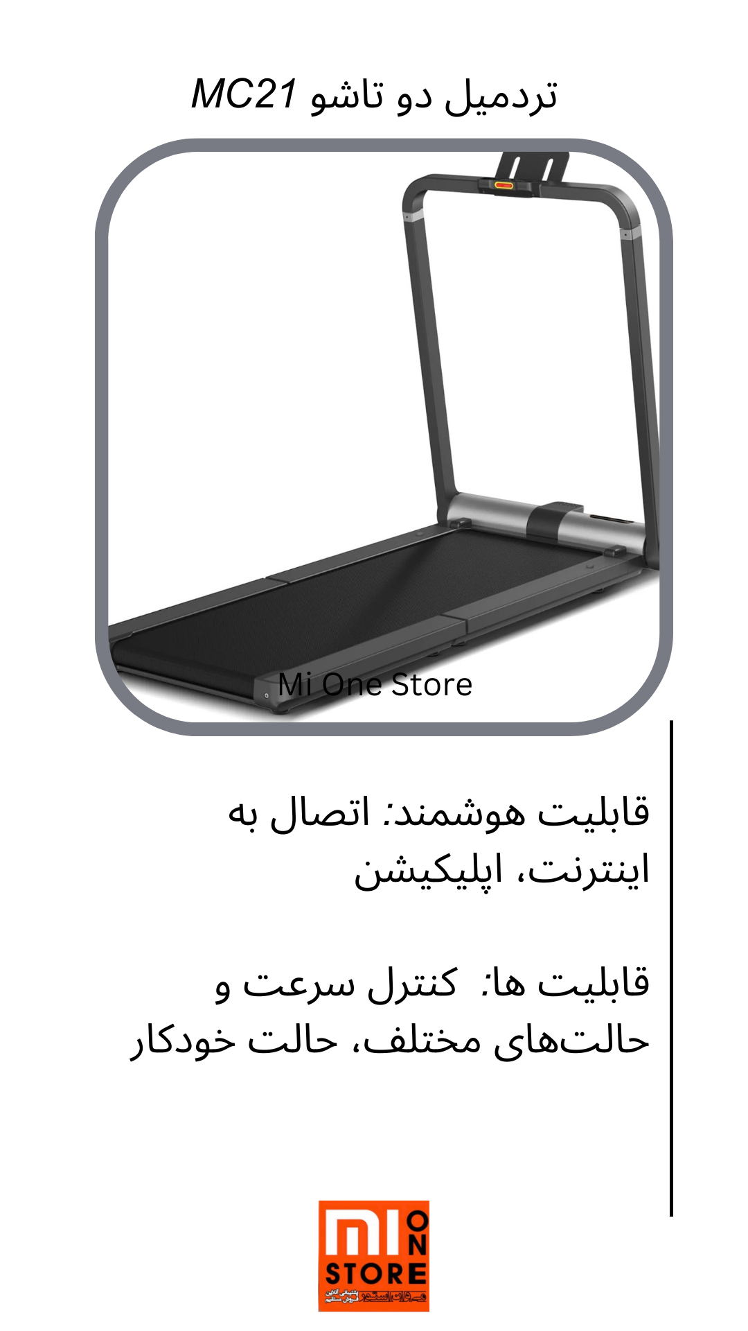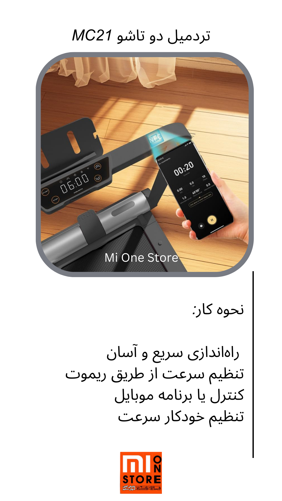 - تردمیل دو تاشو MC21 دارای تنظیم سرعت می باشد بدین ترتیب که سرعت دستگاه را میتوان از طریق ریموت کنترل همراه یا برنامه تلفن همراه تنظیم کرد.
