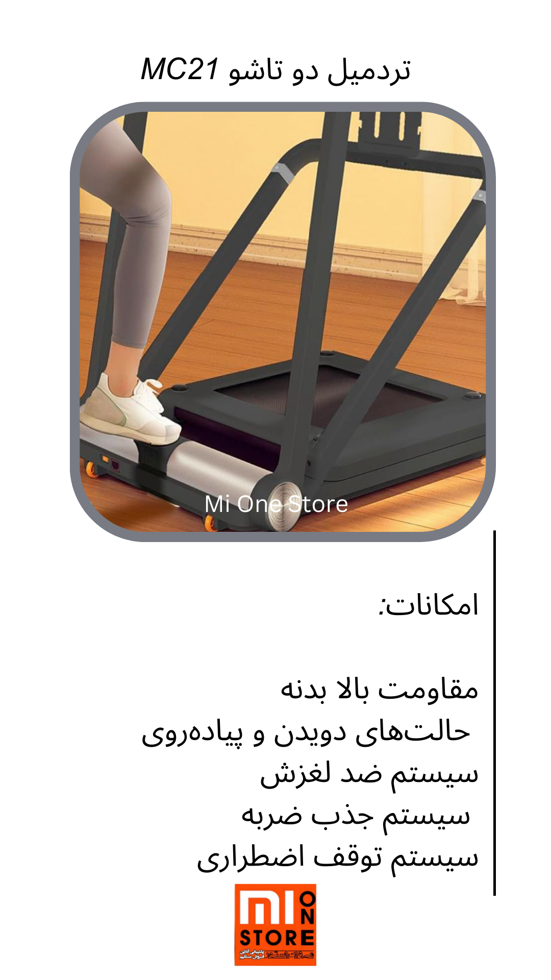 - تردمیل دو تاشو MC21دارای مکانیزم تاشو دوبل است که امکان جمعکردن آن به شکل بسیار جمعوجور را فراهم میکند و به راحتی زیر مبلمان، تخت یا میز قرار میگیرد.