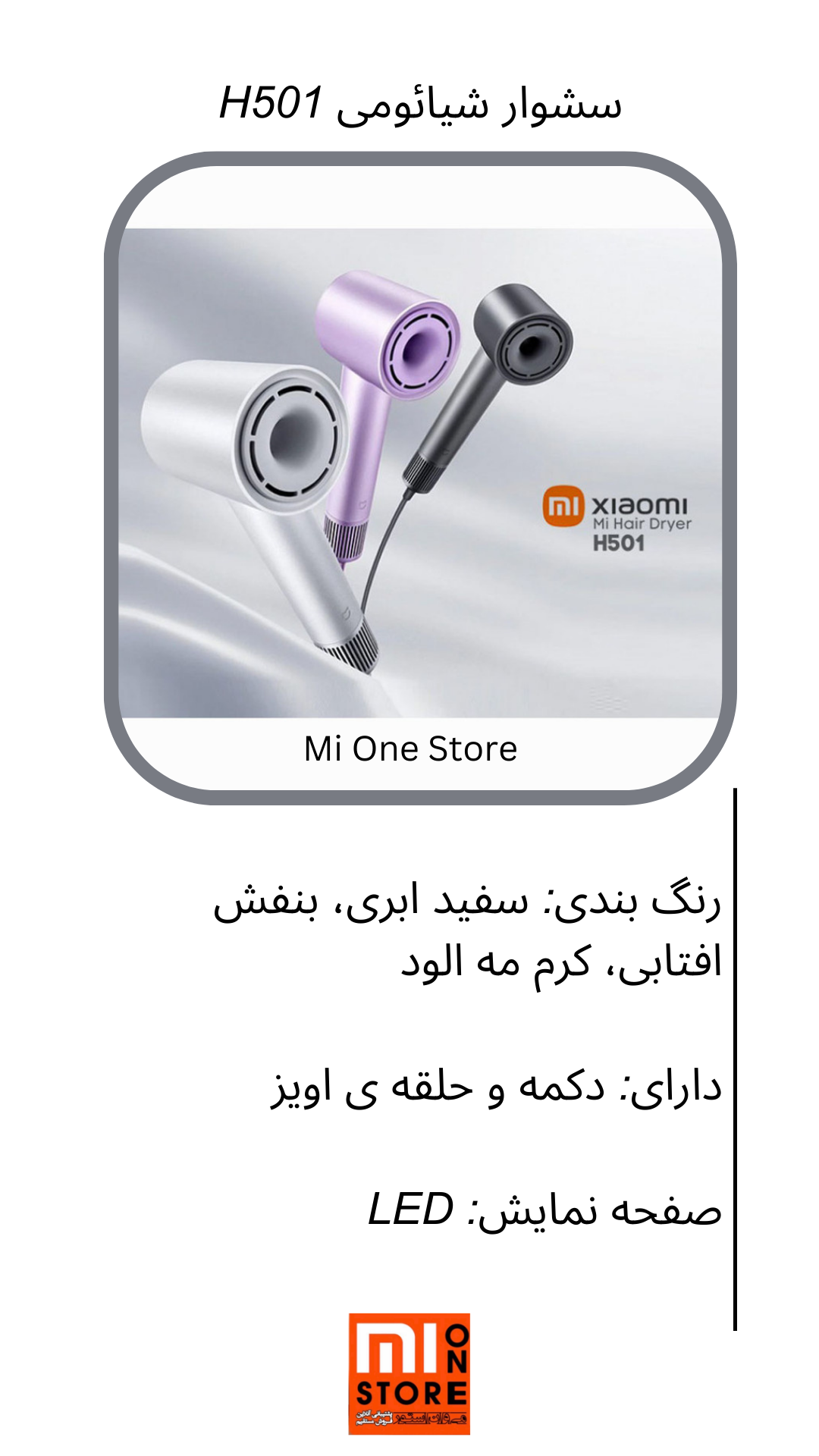- این Mijia H501 High Speed Hair Dryer دارای نمایش دما با تغییرات رنگ می باشد بدین ترتیب که با یک نشانه بصری از دمای جریان هوا توسط یک حلقه LED چهار رنگ ارائه می شود که بسته به دما تغییر می کند( آبی: هوای خنک، نارنجی: هوای گرم، قرمز: هوای گرم، سه رنگ: چرخه هوای سرد به گرم).