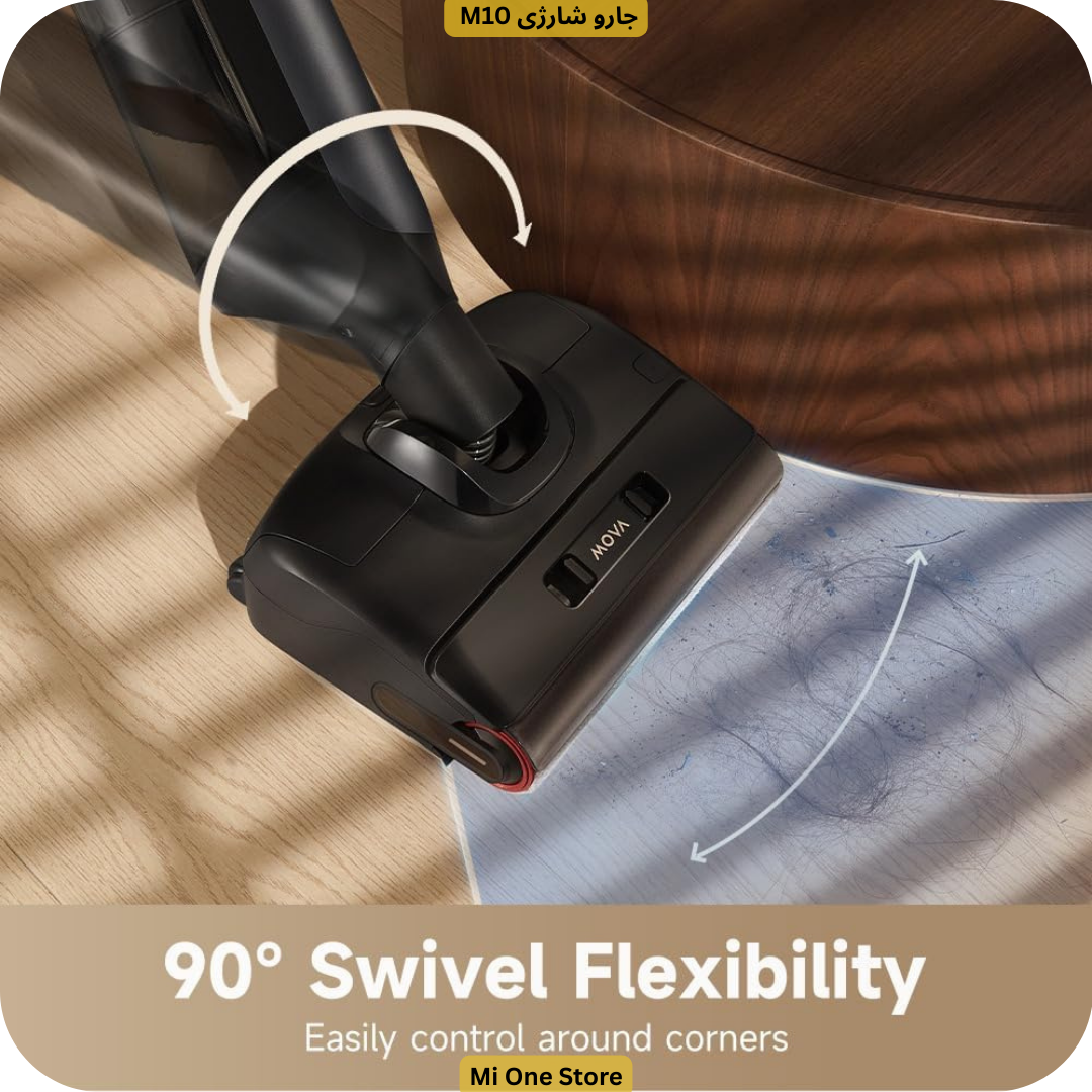 جارو شارژی مووا M10 دارای محور چرخشی پیشرفته با قابلیت انعطاف ۹۰ درجه است. این ویژگی امکان حرکت نرم و دقیق در اطراف پایههای مبلمان، گوشههای میز و فضاهای تنگ را فراهم میکند. کنترل بهتر حرکت دستگاه باعث کاهش خستگی شما در زمان نظافت میشود و تمیزکاری را سریعتر و مؤثرتر میسازد. این انعطافپذیری بالا، M10 را به گزینهای ایدهآل برای خانههای پرجزئیات تبدیل کرده است.