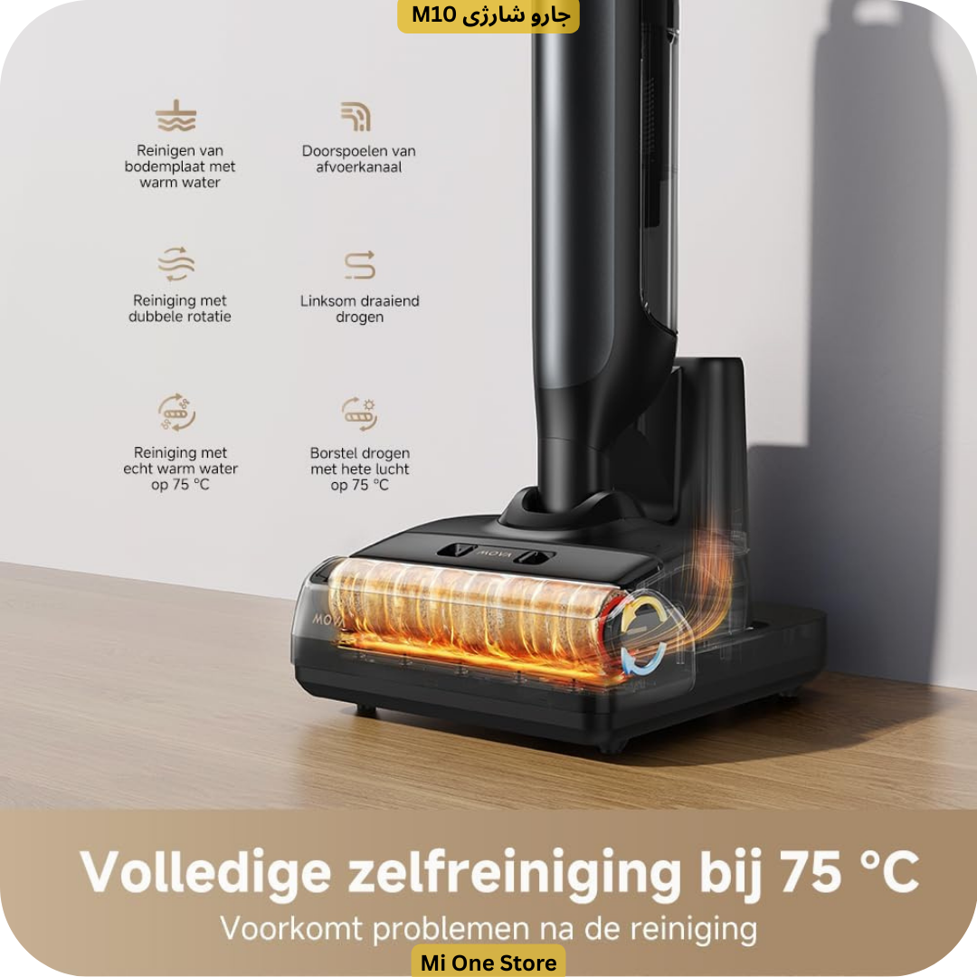 یکی از ویژگیهای برجسته جارو شارژی Mova M10، قابلیت خودتمیزشوندگی برس با آب گرم است. آب با دمای ۱۶۷ درجه فارنهایت (معادل حدود ۶۷ درجه سانتیگراد) بهطور مؤثر آلودگیها، چربیها و باکتریها را از برس پاک میکند. در این دستگاه پس از شستوشوی خودکار، برس بهصورت اتوماتیک وارد مرحله خشک شدن میشود. این فرآیند نهتنها بهداشت دستگاه را تضمین میکند، بلکه عمر مفید برس را نیز افزایش میدهد.