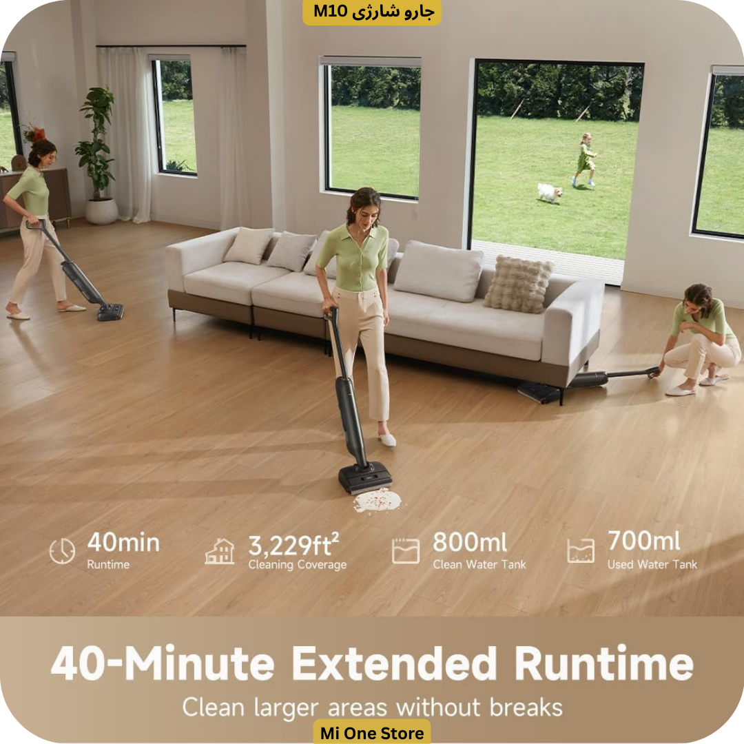 جارو شارژی M10 دارای باتری با ظرفیت بالا است که در حالت هوشمند تا ۴۰ دقیقه زمان کار مداوم ارائه میدهد. این میزان شارژ برای تمیز کردن خانههایی با متراژ تا حدود ۳۲۲۹ فوت مربع کاملاً کافی است. بیسیم بودن دستگاه آزادی عمل بیشتری به شما میدهد و محدودیتهای ناشی از کابل برق را بهطور کامل حذف میکند.