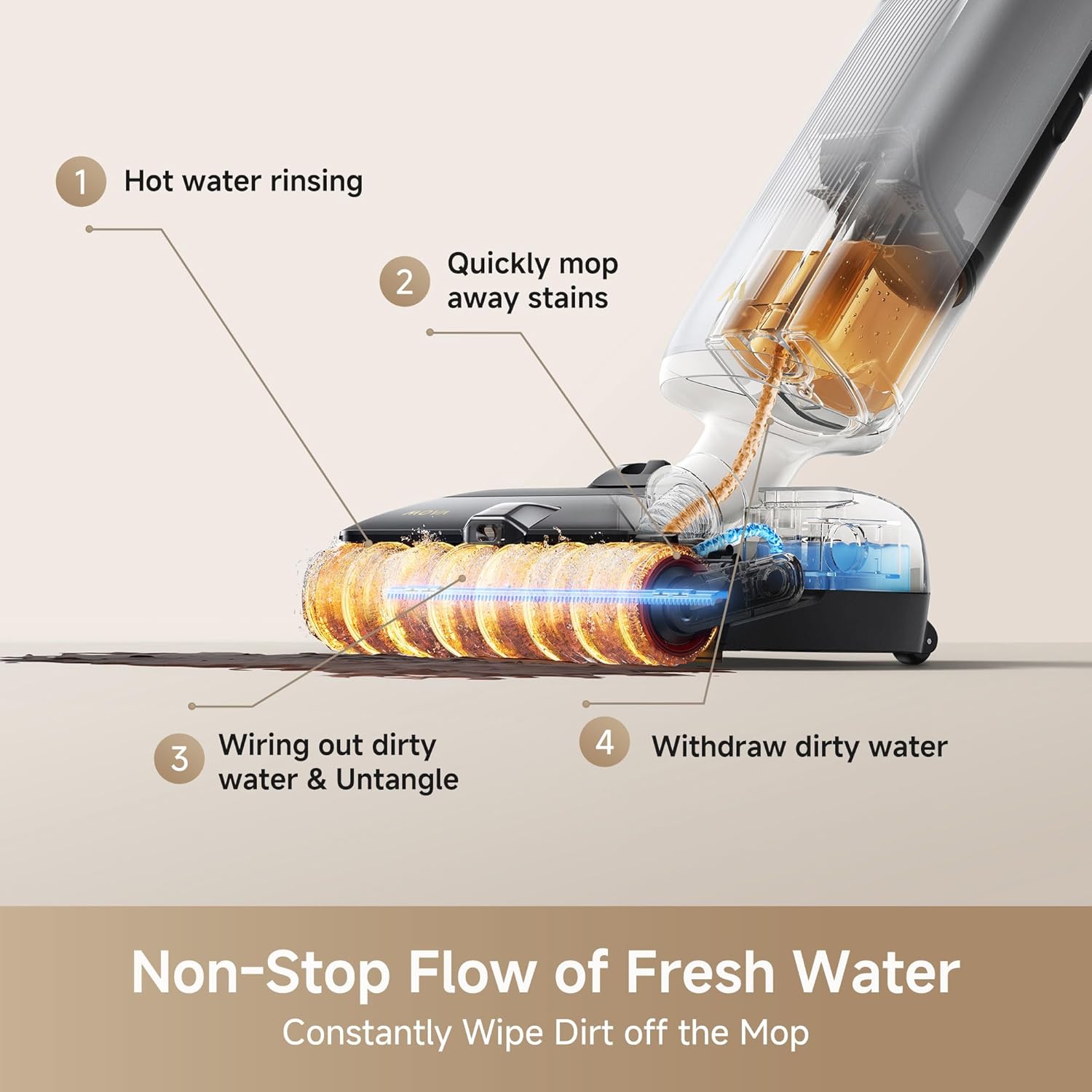 یکی از دردسرهای جاروهای مرطوب معمولی این است که برس/پد آن‌ها پس از استفاده یا باید به‌صورت دستی شسته شود و یا بوی ناخوشایند و رشد میکروب‌ها ایجاد گردد. Mova X4 Pro این مشکل را با سیستم خودکار حل کرده است. بدین ترتیب که این جارو شست‌وشوی خودکار برس با آب داغ (100 °C) دارد و پس از نظافت، برس درون داک شارژ یا ایستگاه مخصوص به‌صورت خودکار با آب خیلی گرم شسته می‌شود تا باقی‌مانده آلاینده‌ها، چربی و لکه از بین برود.